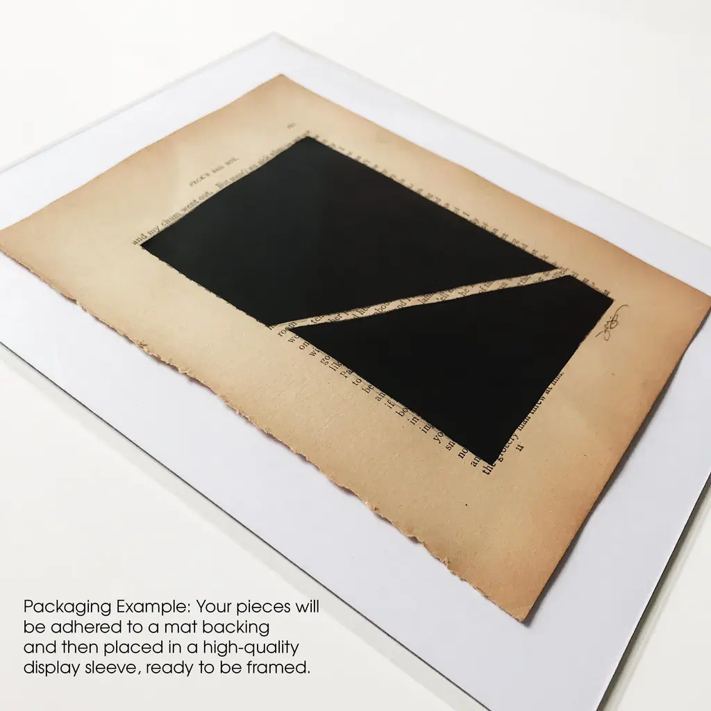 These original, custom-made pieces of art from Josh Young are hand-painted and hand-signed on top of antique book pages. Each piece will be made-to-order and exact page numbers will vary. Measurements: Each piece is roughly 5x7 and comes adhered on a thick, 8x10 white mat backing, enclosed in a professional plastic exhibit sleeve, ready to be framed. *Frames not included Medium: Mixed media. Oil on an antique book pages These pieces are made to order so please allow 2-3 weeks to ship.