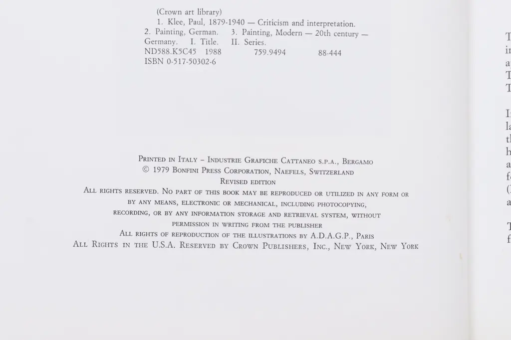 Klee by Denys Chevalier. Hardcover book with dustjacket. Published in 1979 by Crown Publishers Inc of New York. Printed in Italy. 51 Illustrations in color, 23 illustrations in black and white, 96 pages.