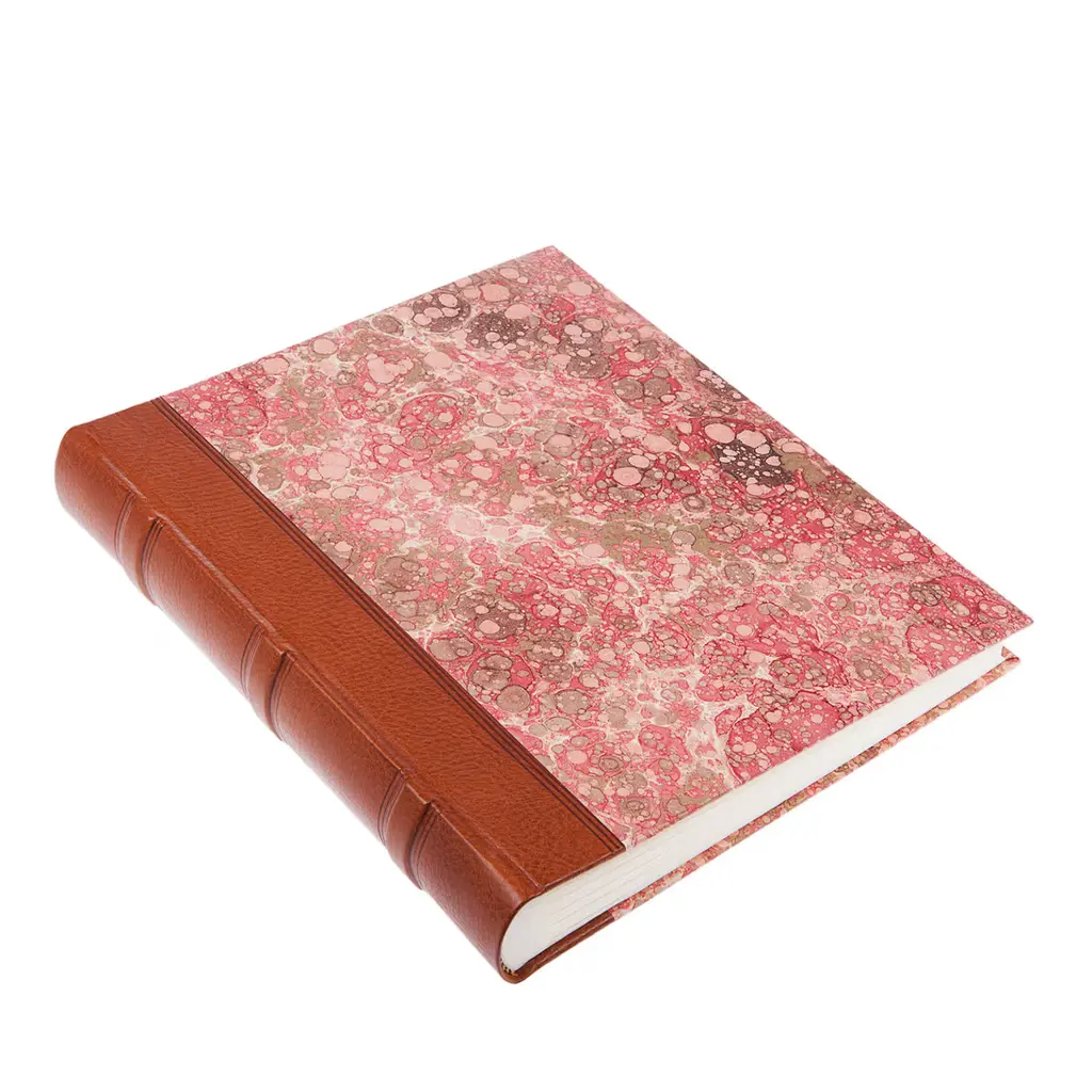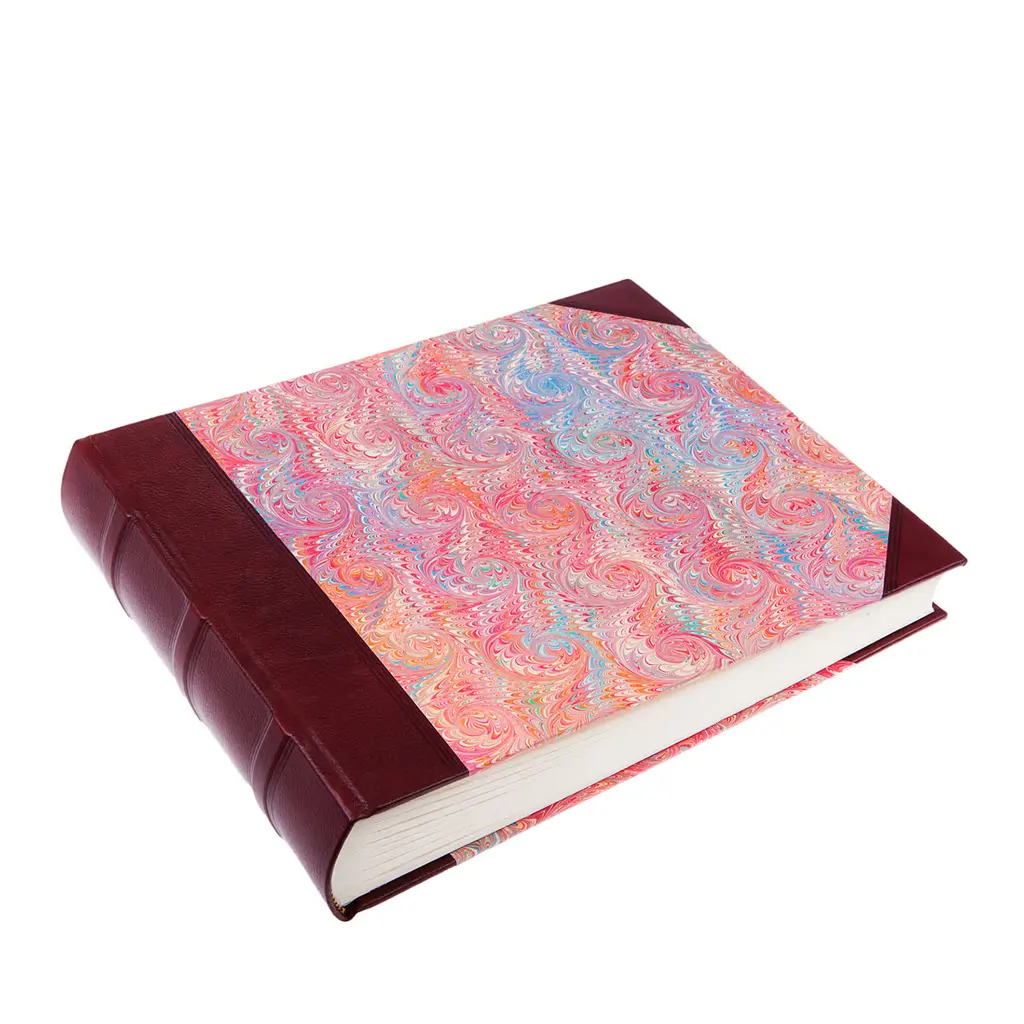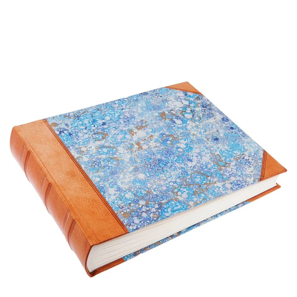 The laccio blue notebook features a cover combining natural tanned leather with hand-marbled paper, showcasing a unique blend of textures and patterns. Designed with plain pages, this medium-sized notebook is suited for versatile uses, from journaling to sketching. A leather strap closure adds functionality and an elegant finishing touch, making it a refined accessory for both lifestyle and office settings.