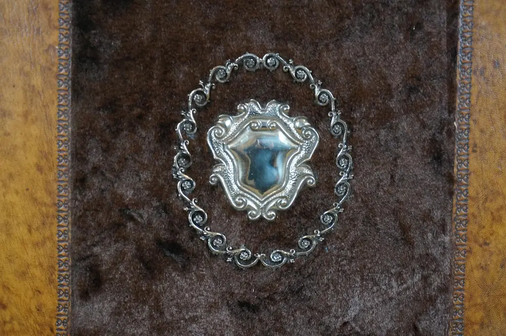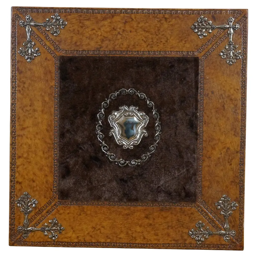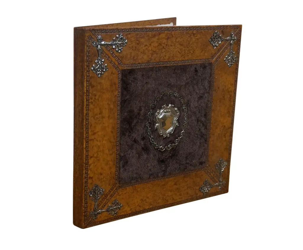 Late 20th century Maitland Smith Italian Baroque style style photo album / scrap book. Bound in mottled tooled leather with panel of faux fur at the center, and accented with a shield and floral silver plate appliques. Raw edged blank pages. 50 Pages interior.Dimensions:14.75" x 1.25" x 15" (Width x Depth x Height)