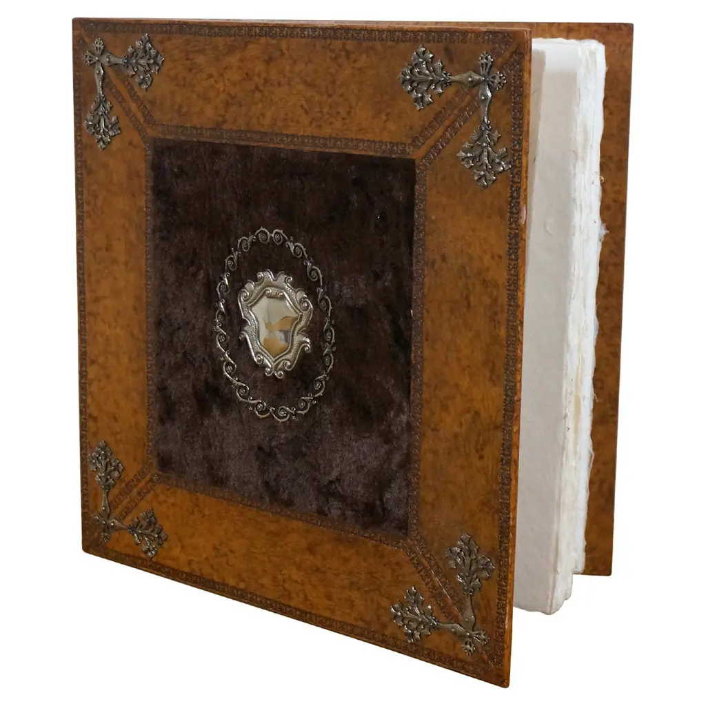 4 available - Late 20th century Maitland Smith Italian Baroque style style photo album / scrap book. Bound in mottled tooled leather with panel of faux fur at the center, and accented with a shield and floral silver plate appliques. Raw edged blank pages. 50 pages interior. Unsigned Dimensions: 14.75" x 1.25" x 15" (Width x Depth x Height)