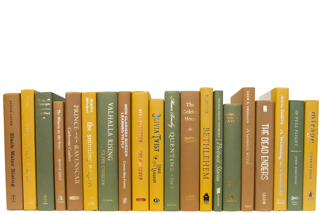 One linear foot of authentic modern hardback books in varied shades of medium brown, saffron yellow, and fir green. All books are published 1980-present and include a variety of literary works, period novels and topical texts with light overall wear. Contains 10-12 books with an average height of 8.5-9.5". Order as many linear feet as you need to complete your project. Titles will differ from those pictured. If ordering multiple quantities titles may be duplicated.