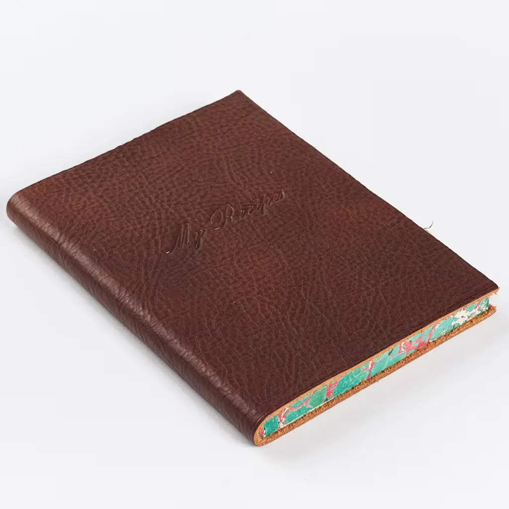 This soft, full-grain leather recipe book features lined, ivory-colored, acid-free paper. Its cover is embossed with the words My Recipes and the user's monogram or name can be added in gold lettering. Ivory-colored dust bag included. This item makes the perfect gift for foodies, cooking enthusiasts and home chefs so their favorite meals are always organized and at hand.