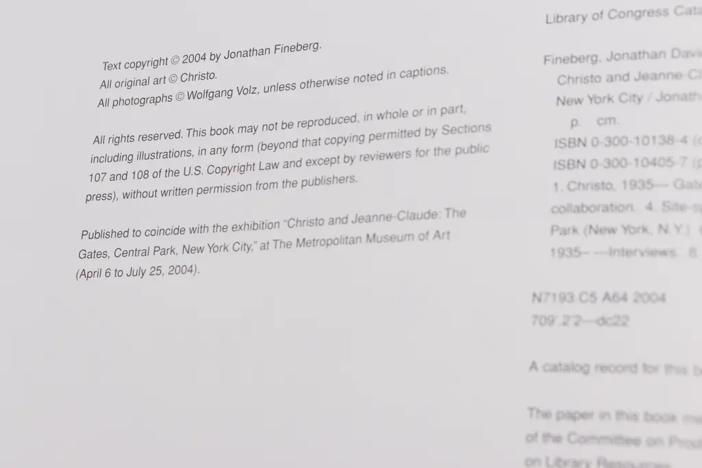 Christo and Jeanne-Claude, On the Way to the Gates, Central Park, New York City. Book by Jonathan Fineberg with photographs by Wolfgang Volz. Published in conjunction with a major exhibition at the Metropolitan Museum of Art which opened in April 2004. Hardcover book with dust jacket, 212 pages. A great coffee table book.