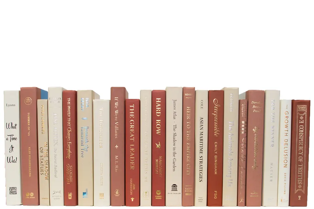 Take your design to a new level with the Modern Carnation Color By The Foot from Booth & Williams. One linear foot of authentic modern hardback books in varied shades of cream, sienna and muted coral pink. All books are published 1980-present and include a variety of literary works, period novels and topical texts with light overall wear. Contains 10-12 books with an average height of 8.5-9.5". Order as many linear feet as you need to complete your project.Titles will differ from those pictured.