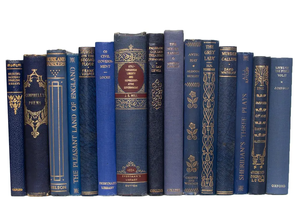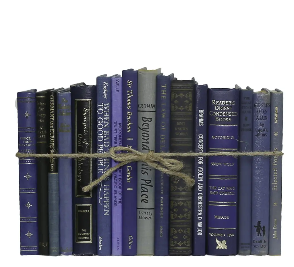 One linear foot of authentic vintage petite hardback books in varied shades of blue with gilt accents on spines and front covers. Books may include embossing and gilted page ends. All books are published prior to 1949 and include a variety of history and classical works. Contains 12-15 books under seven inches in height and hand-wrapped in jute twine. Order as many ColorPaks as you need to complete your project. Titles will differ from those pictured.