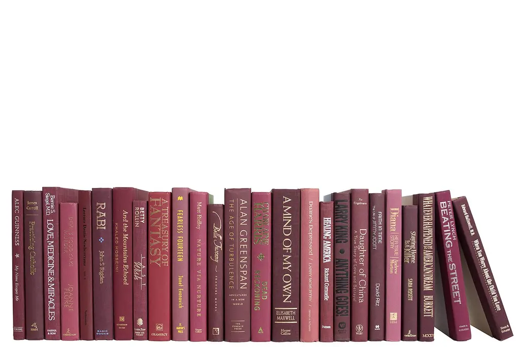 Take your design to a new level with the Modern Bordeaux Book Wall S/100 from Booth & Williams. One hundred (100) authentic modern hardback books in crisp shades of burgundy. All books are published 1980-present and include a variety of literary works, period novels and topical texts with light overall wear. Books total approximately 10 linear feet with an average height of 8.5-9.5". ACTUAL TITLES WILL VARY FROM THOSE PICTURED BUT WILL MAINTAIN THE SAME COLOR PATTERN.