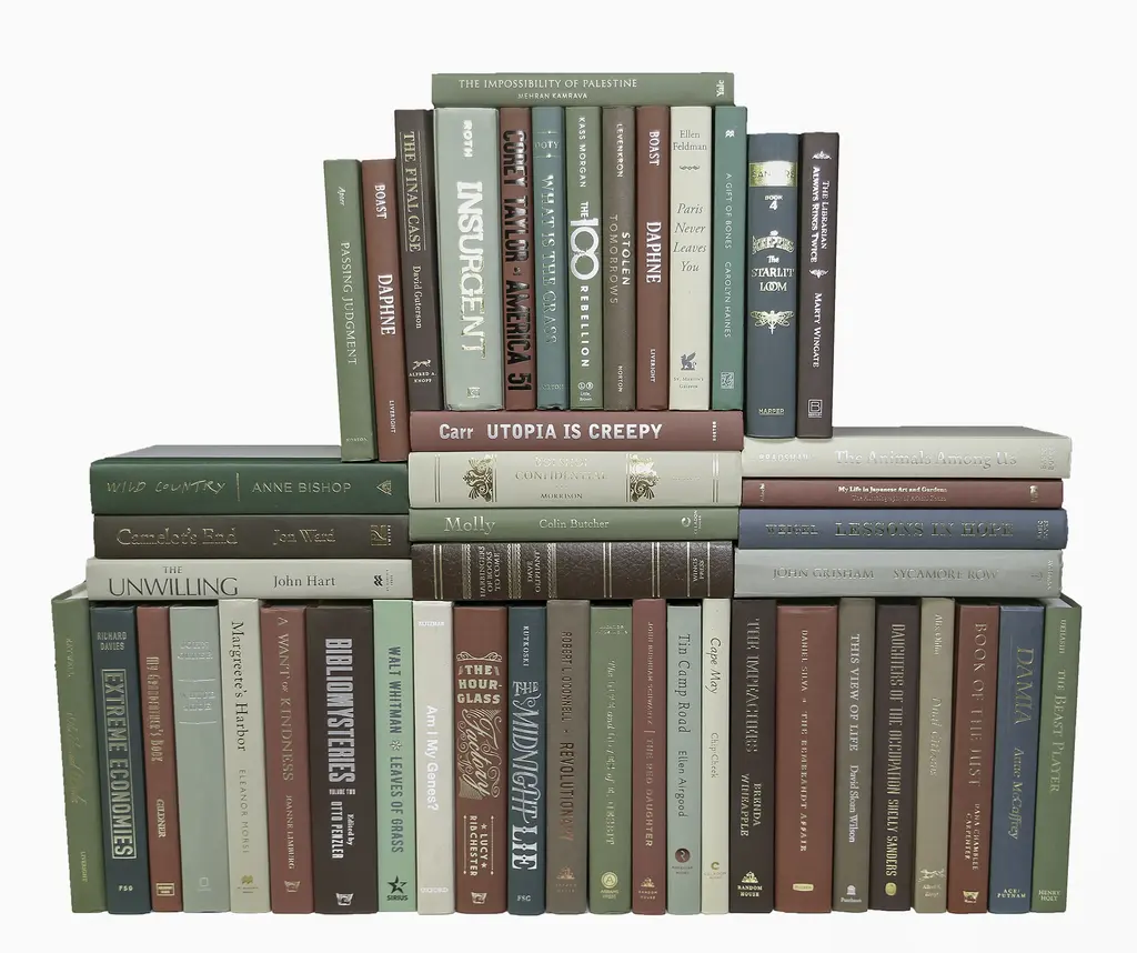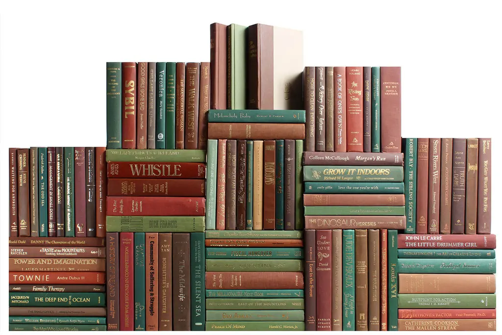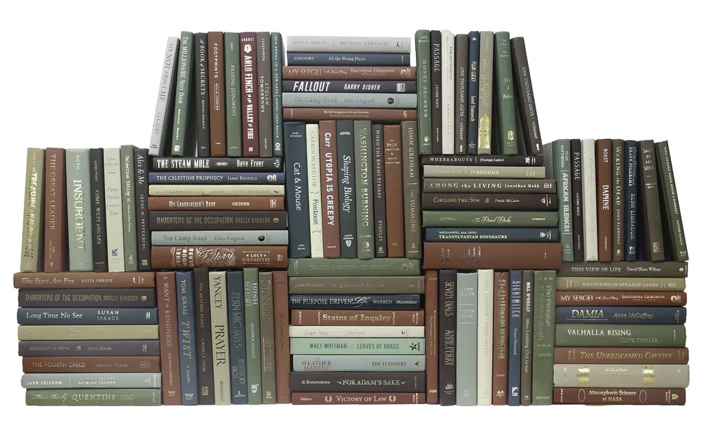Take your design to a new level with the Modern Cabin Book Wall S/100 from Booth & Williams. One hundred (100) authentic modern hardback books in crisp shades of green, brown, tan and rust. All books are published 1980-present and include a variety of literary works, period novels and topical texts with light overall wear. Books total approximately 10 linear feet with an average height of 8.5-9.5. Actual titles will vary from those pictured but will maintain the same color pattern.