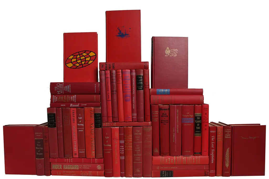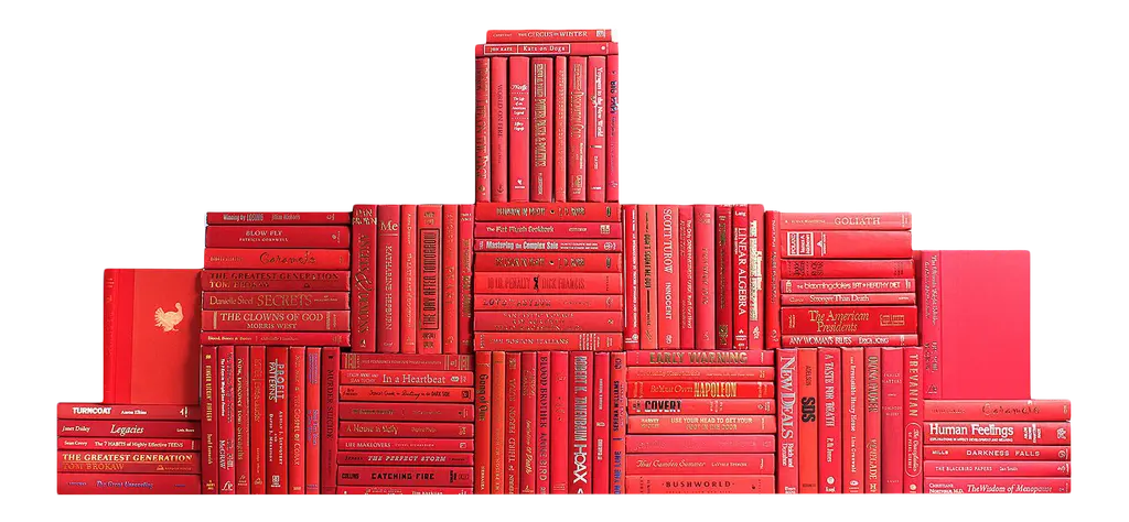 Take your design to a new level with the Modern Orchard Book Wall S/100 from Booth & Williams. One hundred (100) authentic modern hardback books in crisp shades of bright red. All books are published 1980-present and include a variety of literary works, period novels and topical texts with light overall wear. Books total approximately 10 linear feet with an average height of 8.5-9.5". ACTUAL TITLES WILL VARY FROM THOSE PICTURED BUT WILL MAINTAIN THE SAME COLOR PATTERN.