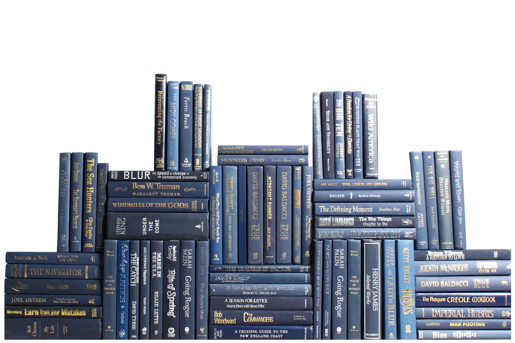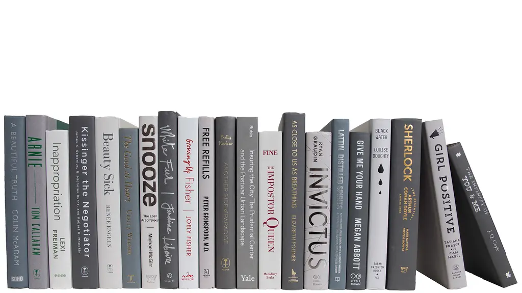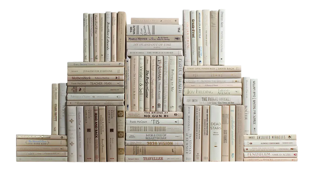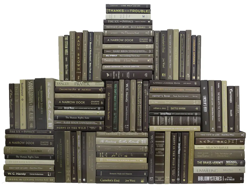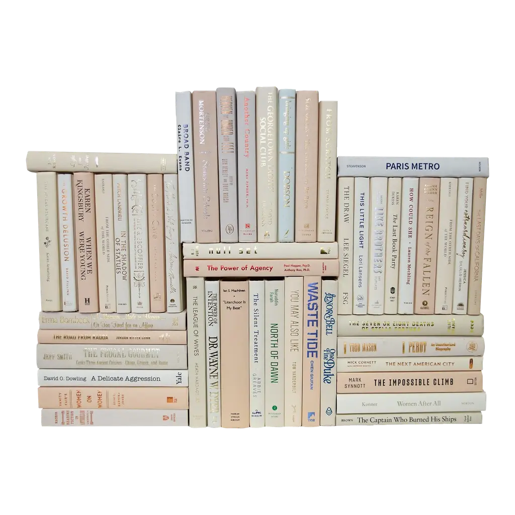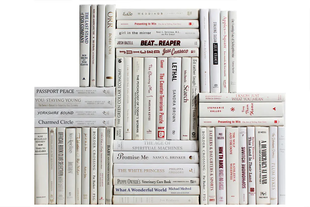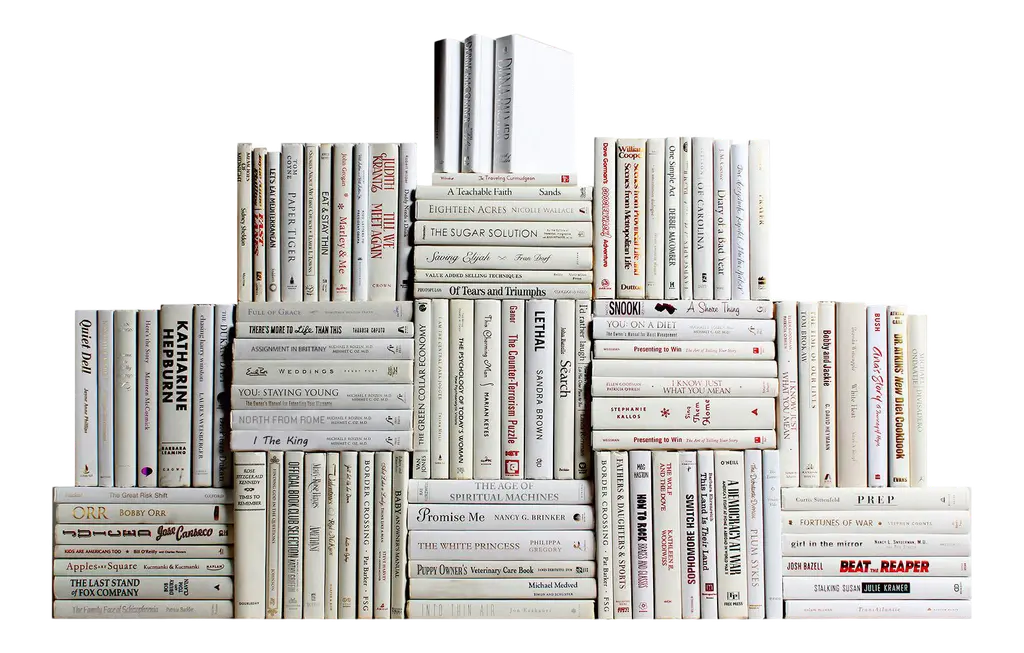 One hundred authentic modern hardback books in crisp shades of bright white. All books are published 1980-present and include a variety of literary works, period novels and topical texts with light overall wear. Books total approximately 7.5 linear feet with an average height of 8.5-9.5". Actual titles will vary from those pictured but will remain the same color pattern. Book titles could be repeated after three linear feet.