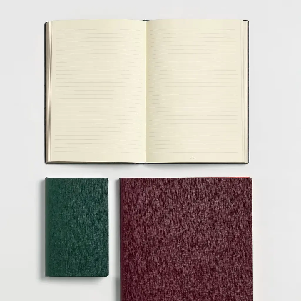 This set of 2 notebooks are strike with their sober yet unique details: the covers are crafted of supple dark green and burgundy-lacquered Saffiano leather. The edges that are hand-painted following antique Florentine techniques. Designed to be suitable for both travel and work use, these notebooks are equipped with a flat pocket and a Pineider-green bookmark and comprise 96 elegant, smooth ivory pages. A refined poem on the last page adds a sophisticated accent to this notebook. The large notebook measures cm 19x25 (h) and the small notebook measures cm 9x14 (h).
