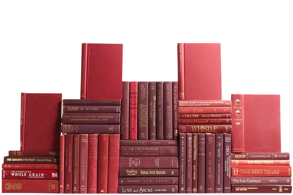 Take your design to a new level with the Modern Bordeaux Book Wall S/50 from Booth & Williams. Fifty (50) authentic modern hardback books in crisp shades of burgundy. All books are published 1980-present and include a variety of literary works, period novels and topical texts with light overall wear. Books total approximately 5 linear feet with an average height of 8.5-9.5". ACTUAL TITLES WILL VARY FROM THOSE PICTURED BUT WILL MAINTAIN THE SAME COLOR PATTERN.
