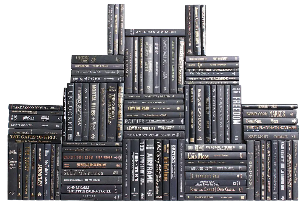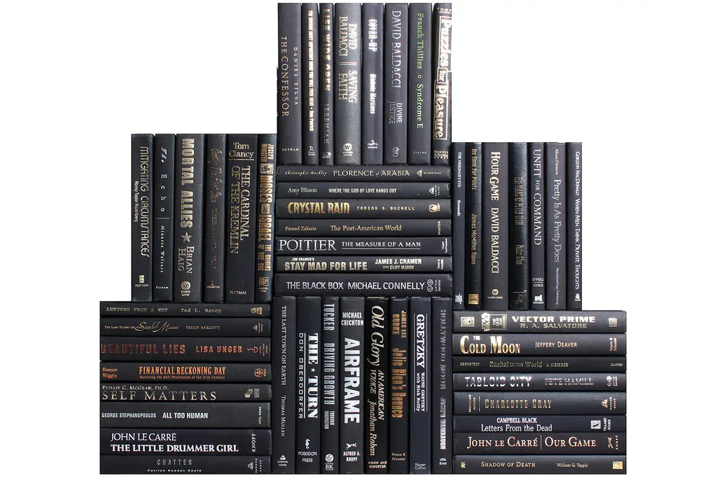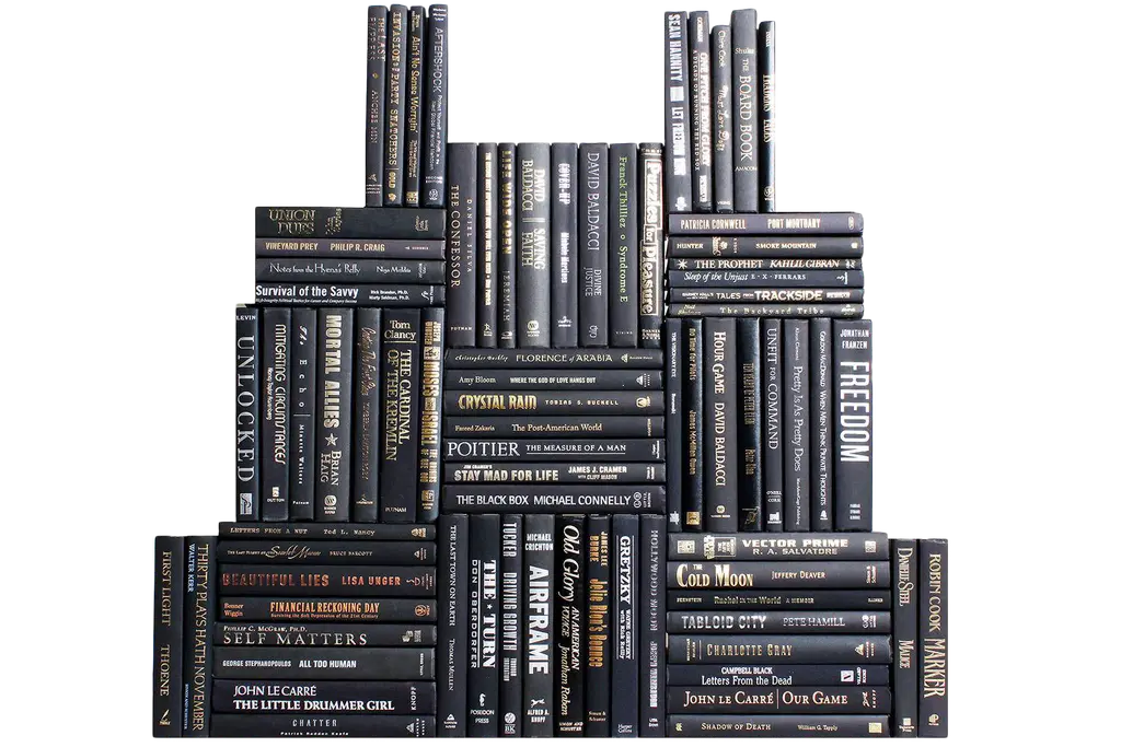 Take your design to a new level with the Modern Onyx Book Wall S/75 from Booth & Williams. Seventy-five (75) authentic modern hardback books in crisp shades of black. All books are published 1980-present and include a variety of literary works, period novels and topical texts with light overall wear. Books total approximately 7.5 linear feet with an average height of 8.5-9.5". ACTUAL TITLES WILL VARY FROM THOSE PICTURED BUT WILL MAINTAIN THE SAME COLOR PATTERN.