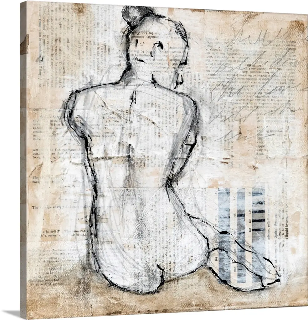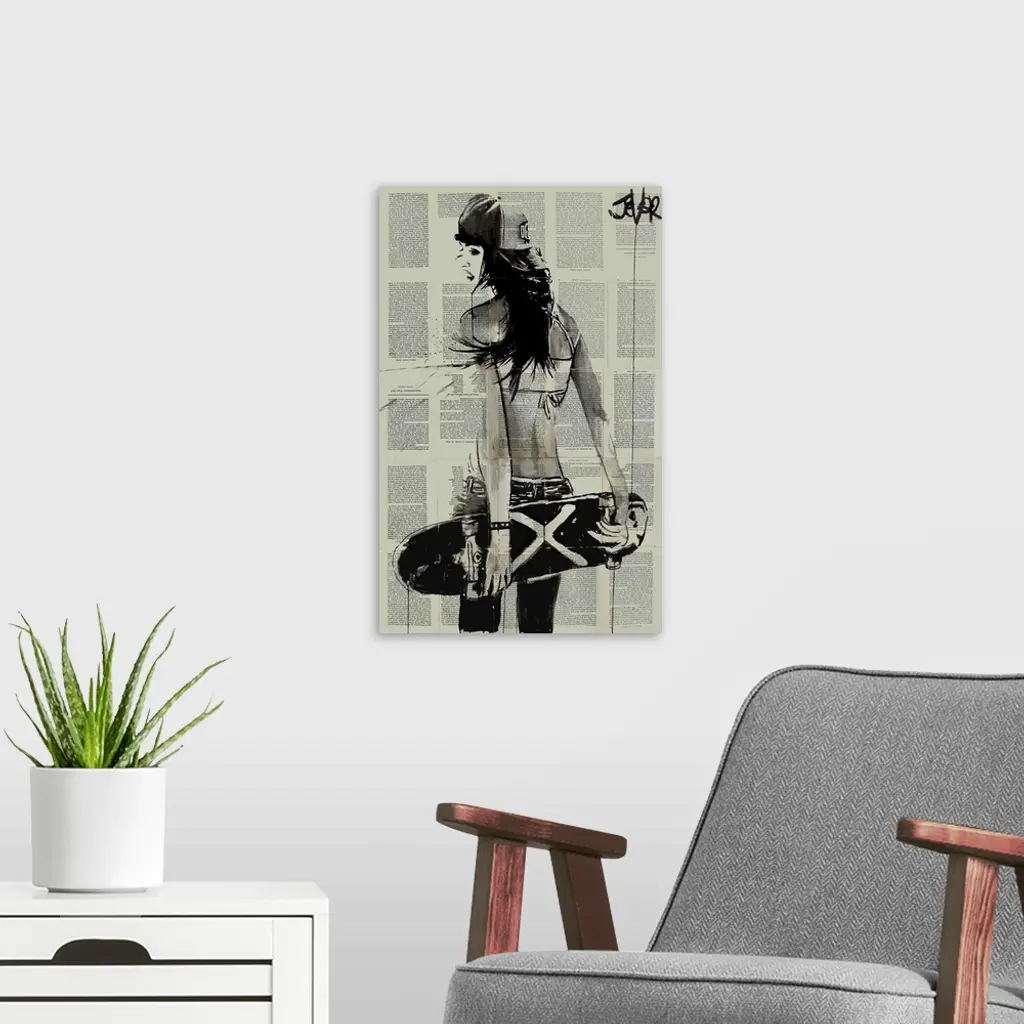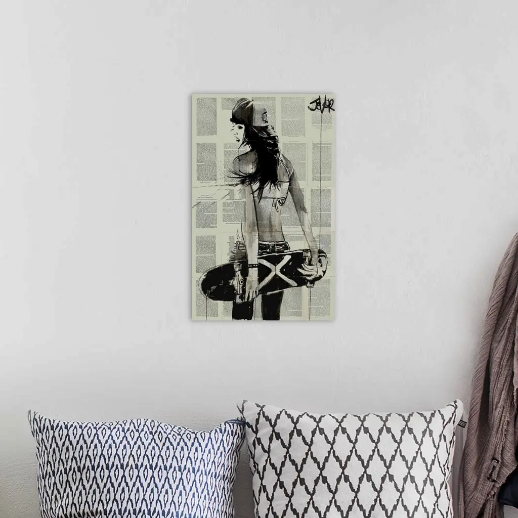 Contemporary urban artwork of a woman holding a skateboard behind her back against a background of tiled book pages.