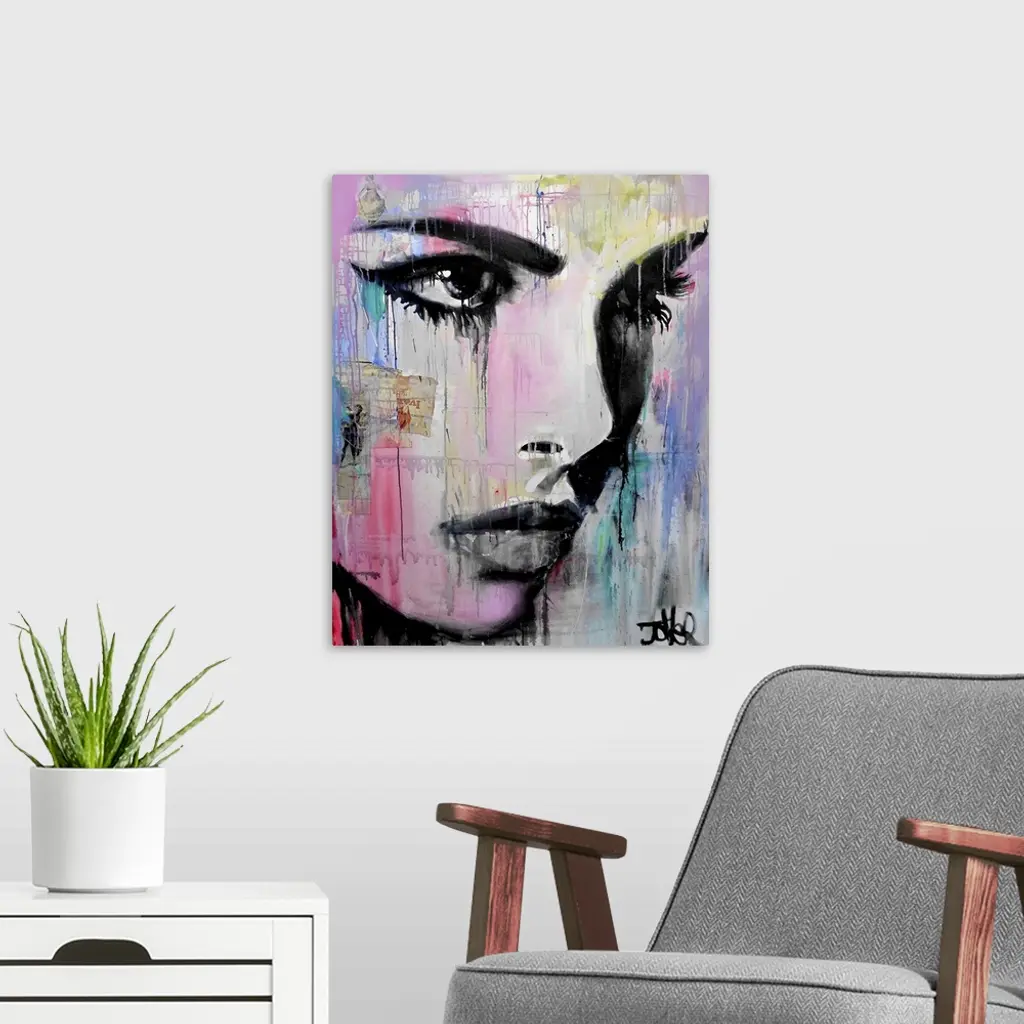 Contemporary urban artwork of a close-up of a woman's face with deep blue eyes against a background of tiled book pages.