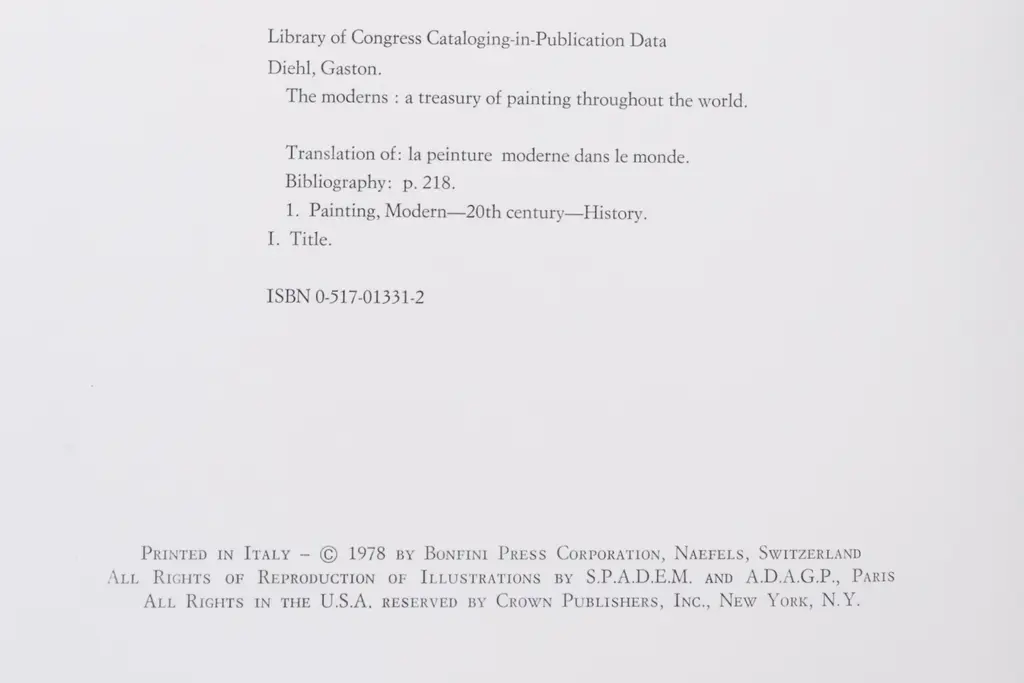 The Moderns by Gaston Diehl, a Treasury of Painting Throughout the World. Hardcover book with dustjacket. First edition published in 1978 by Crown Publishers, Inc. of New York. Printed in Italy. Illustrated, 220 pages.