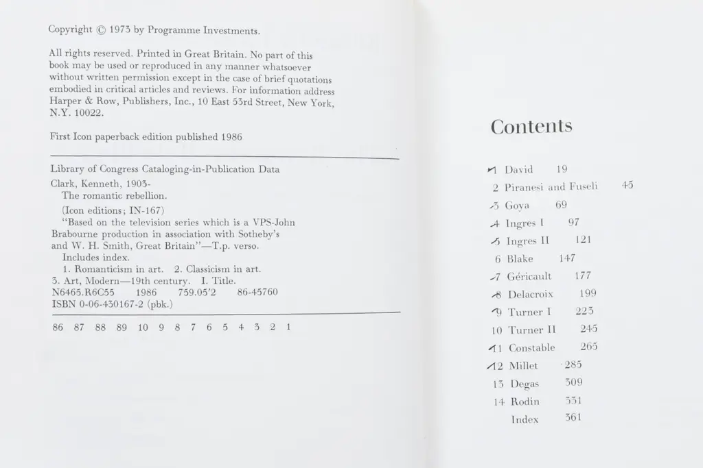 The Romantic Rebellion, romantic versus classic art by Kenneth Clark. Softcover book, published by Harper & Row Publishers of New York in 1986. Printed in Great Britain by Butler & Tanner Ltd of Frome in Somerset. Illustrated, 366 pages.