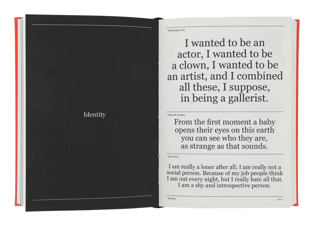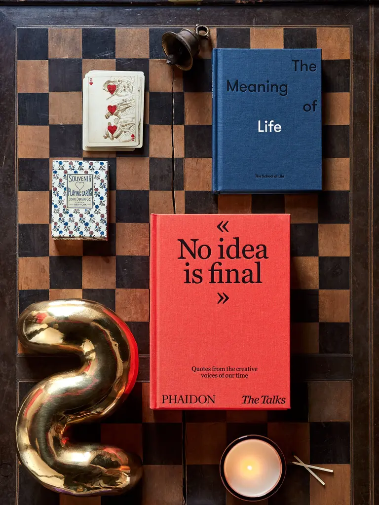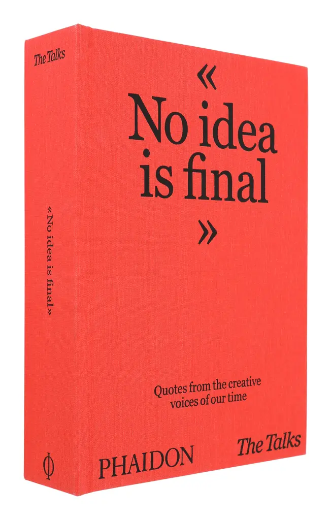 Find endless inspiration from a diverse collection of cultural icons in No Idea Is Final: Quotes from the Creative Voices of Our Time. This uplifting little tome is filled with brief one or two sentence excerpts from interviews originally published in The Talks — a much-loved digital magazine that has featured a candid conversation with a different artist, actor, filmmaker, comedian, designer, musician, author, chef, athlete or director every week for the past decade. Covering everything from age, creativity, dreams, spirituality and rebellion to food, fame, identity, failure, success and love, these bite-sized bits of wisdom are cataloged by topic into thirty-five sections and artfully captured in a simple yet eye-catching font. A virtual pep talk in book form, it’s perfect for gifting or for keeping on hand for whenever you need a little extra motivation. •6.25"W x 1.75"D x 9"H •excerpts from The Talks digital magazine •preface by Sven Schumann and Johannes Bonke•designed by Bureau Borsche•clothbound hardcover•400 pages