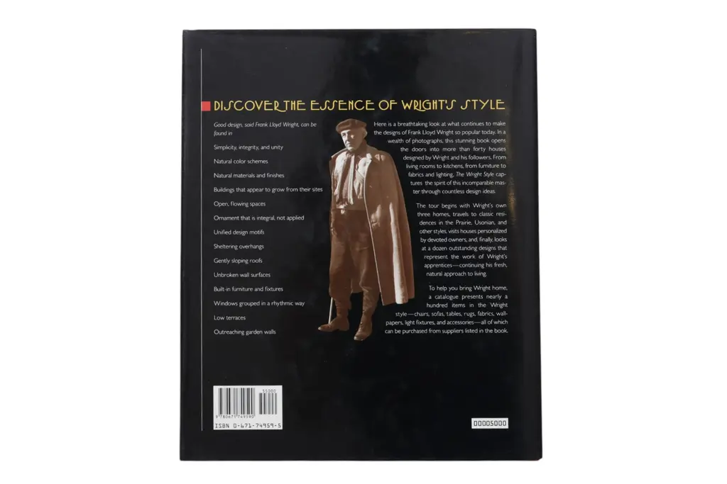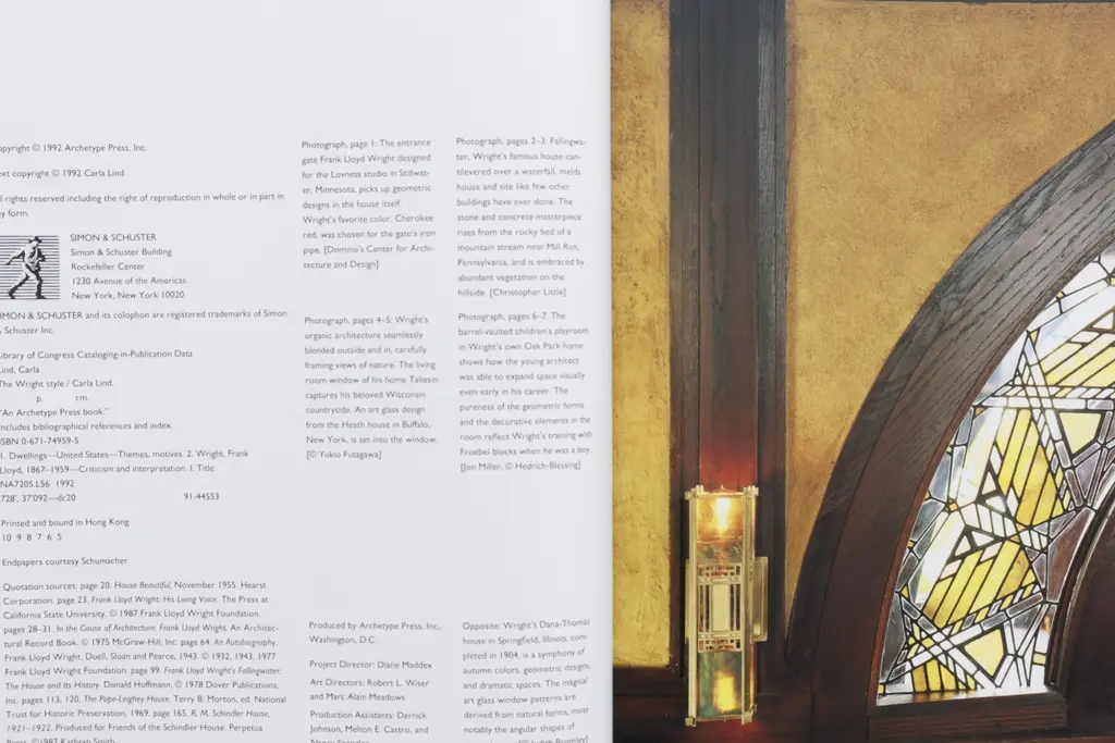 The Wright Style, recreating the spirit of Frank Lloyd Wright by Carla Lind. Hardcover book with dustjacket. Published in 1992 by Simon & Schuster. 224 pages.