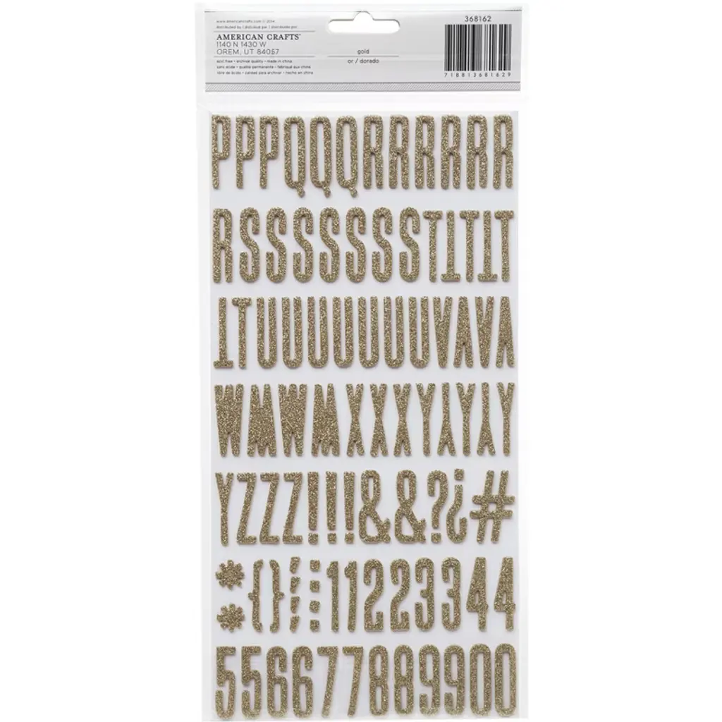 Stickers add the perfect finishing touch to your paper projects. Stickers can be a fun embellishment, a whimsical accent or add elegant polish to scrapbook pages, greeting cards, mixed media and more. This package contains American Crafts Thickers Stickers -Alphabet, Fitzgerald, Gold Glitter, 183 stickers. Imported.