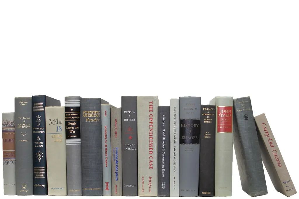 Take your design to a new level with the Vintage Granite Color By The Foot from Booth & Williams. One linear foot of authentic vintage hardback books in beautiful varied shades of light and dark grey. All books are published 1900-1969 and include a variety of literary works, period novels and topical texts with light overall wear. Contains 10-12 books with an average height of 8-9". Order as many linear feet as you need to complete your project. Titles will differ from those pictured.