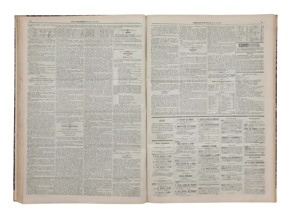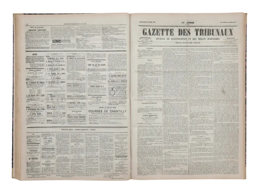 •as found; each is unique in cover and content •19th - 20th century •france Dimensions: •16"W x 1.75"D x 23"H Each of our Vintage La Gazette des Tribunaux Newspaper Collection Books is completely unique and variations should be expected. Please make a note at checkout or send us an email if you would like to receive photos of available options. If we don’t hear from you, we will choose one for you from our selection.