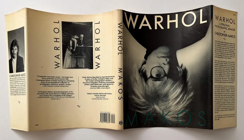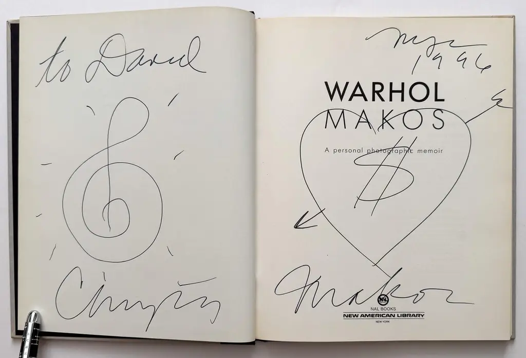 First printing (stated) of this photo essay on Andy Warhol by his friend and collaborator Christopher Makos, “the man who first handed Warhol a camera and taught him how to use it.” Published in 1989 by New American Library. Small 4to (8.5” x 10.5”), hardcover with pictorial dust jacket, 127 pages with b/w photos. Book design by Christopher Makos and Vincent McEvoy with a foreward by Henry Geldzahler and in introduction by Glenn Albin. Makos "was a seminal figure in the 1980's New York art scene, and his photographs have been published in Interview, Rolling Stone, Esquire, and New York Magazine...” Enhanced by a two-page signature by Makos with drawings of a g-clef and a pierced heart with a dollar sign inside, in homage to Warhol.