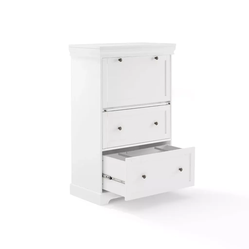 Traditional hideaway desks are usually large striking pieces of furniture, high on style and function. The Alena Secretary Desk brings that same energy to a smaller, space-saving package. Featuring a drop-down desk for a laptop plus space for an external monitor, you'll have everything you need at your fingertips. Once your workday comes to an end, everything can be neatly stored behind the folding desktop. With one file drawer and one full-extension drawer, this office armoire will keep you organized and clutter-free.