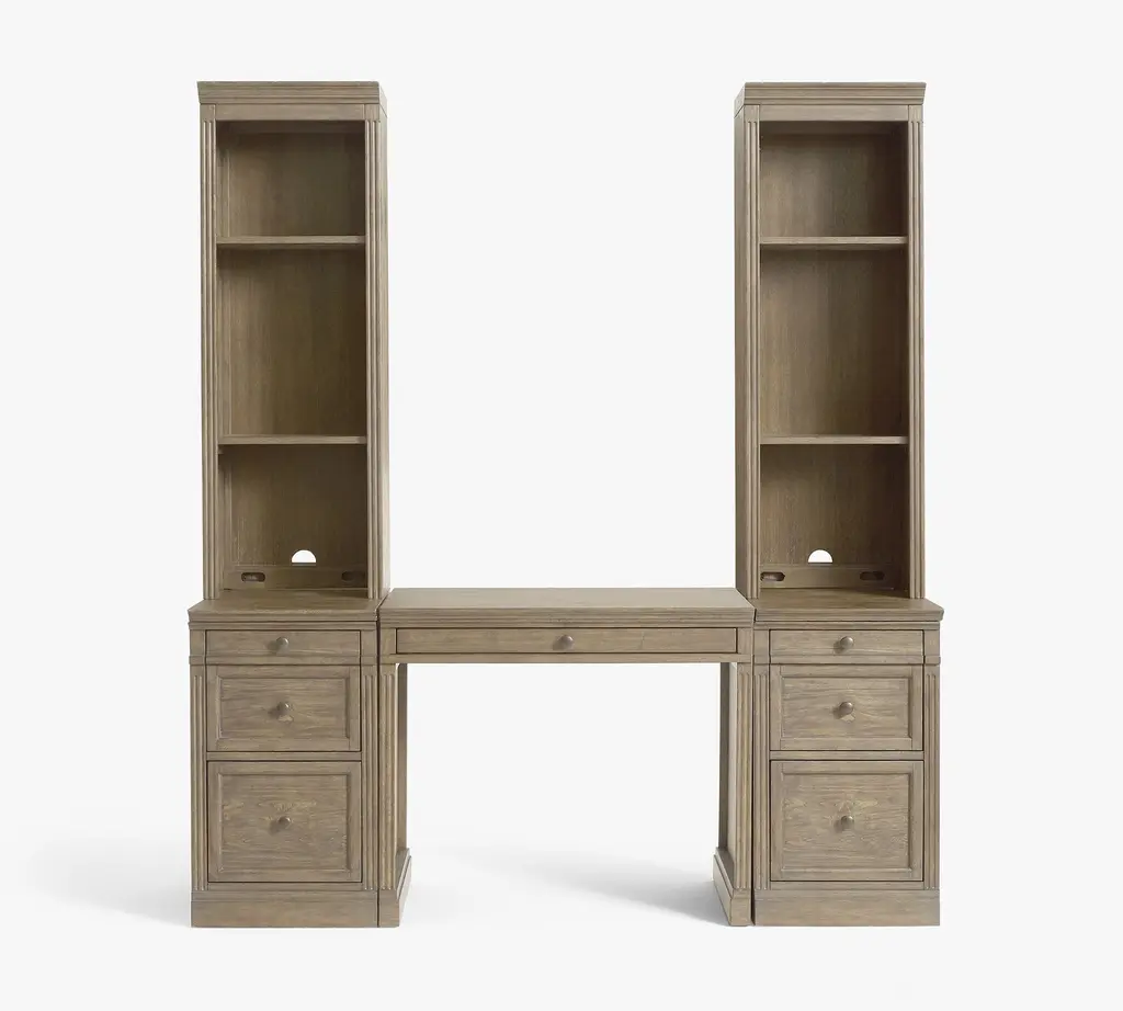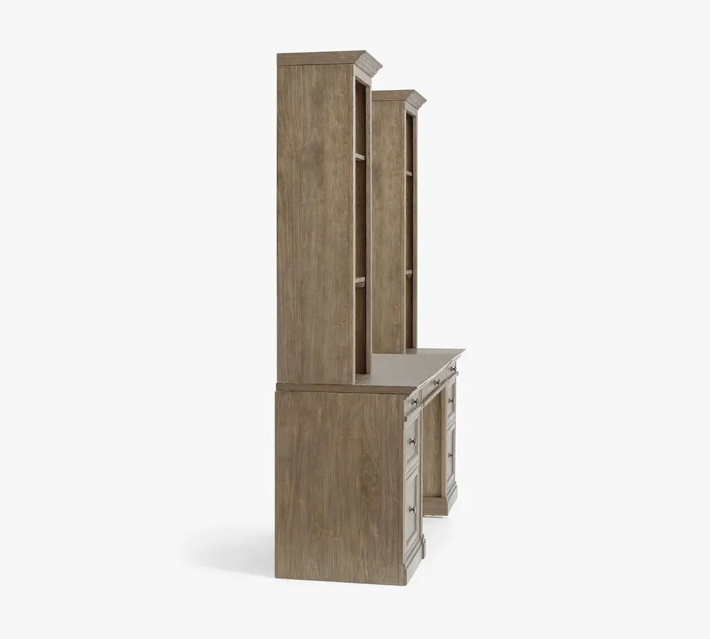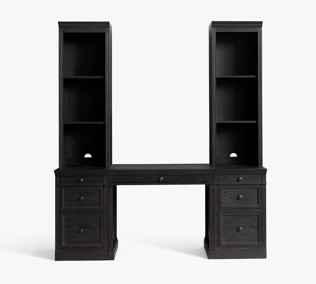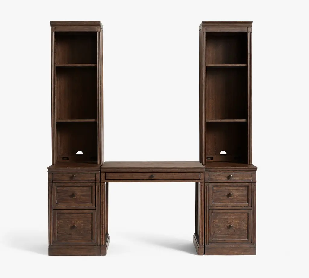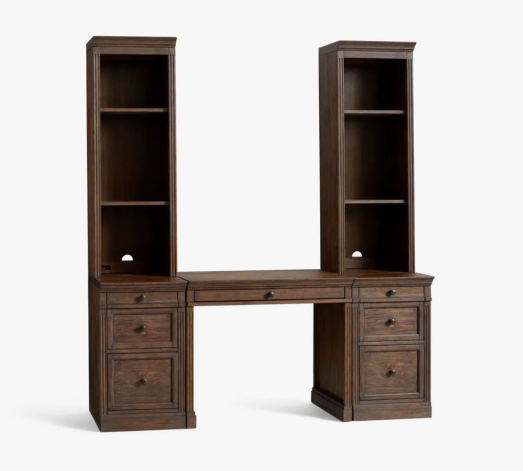Classic details like crown molding, fluted trim, and hand-applied finishes give this customizable collection timeless appeal. Setting a desk between two bookcase towers and file cabinets, this suite brings order to the tasks at hand. Designed to work seamlessly with the collection’s other modular components, it creates a functional and sophisticated workspace.