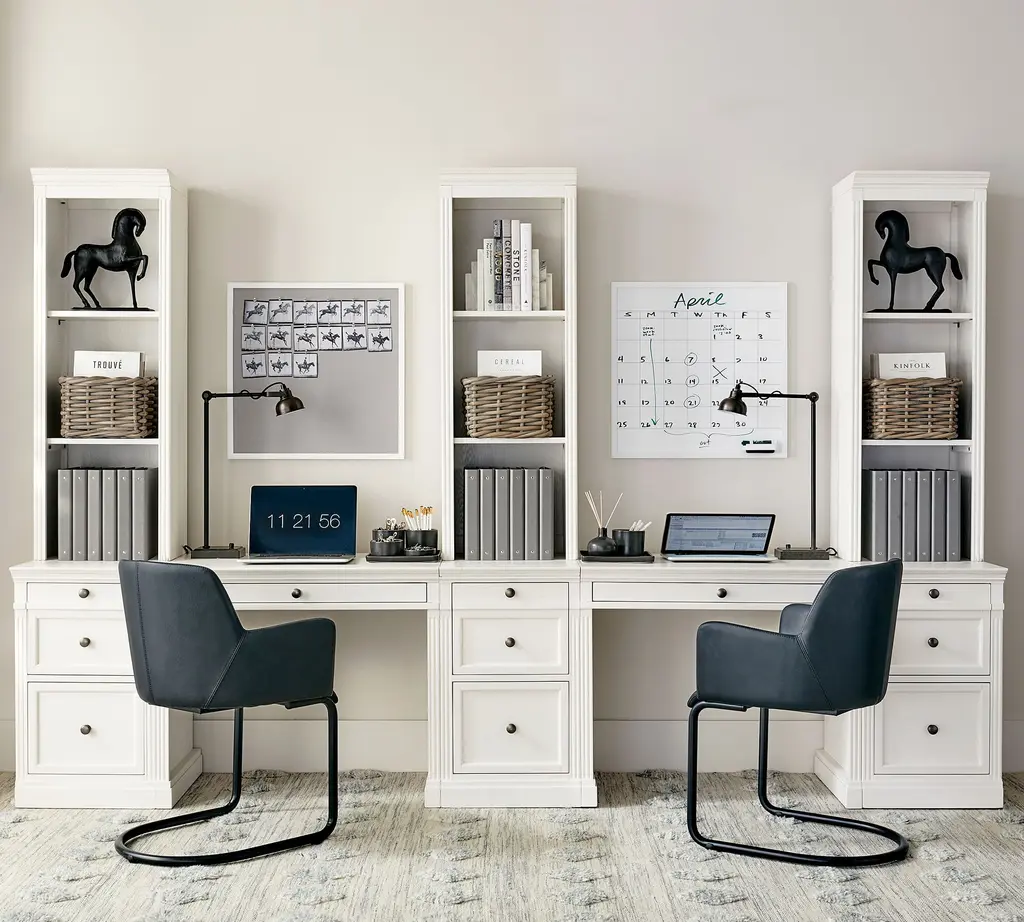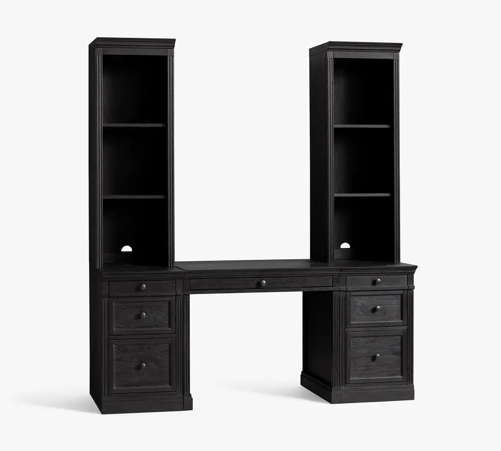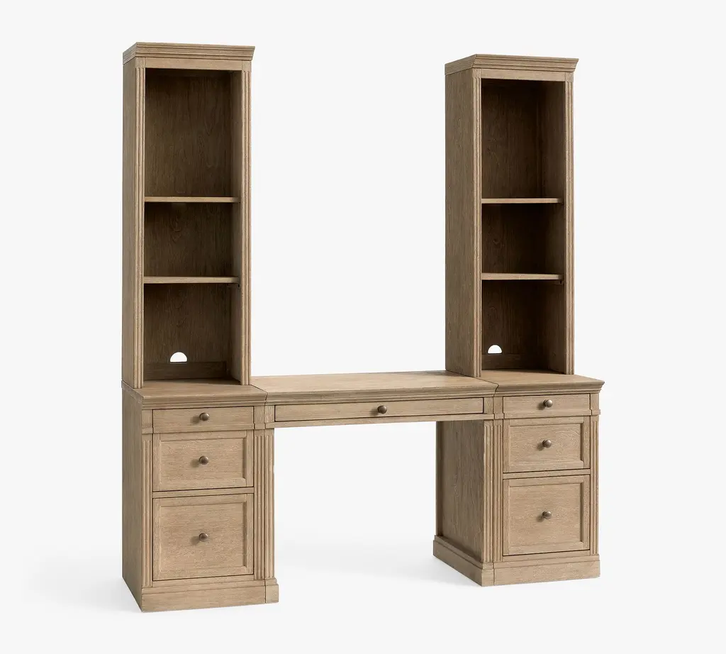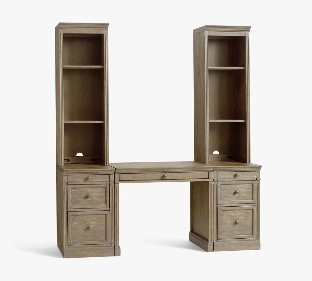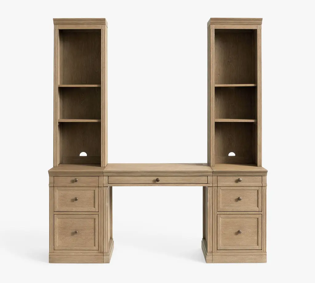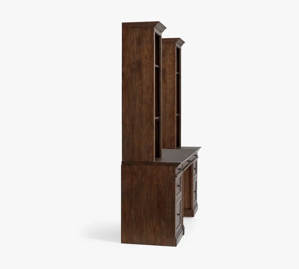 Classic details like crown molding, fluted trim, and hand-applied finishes give this customizable collection timeless appeal. Setting a desk between two bookcase towers and file cabinets, this suite brings order to the tasks at hand. Designed to work seamlessly with the collection’s other modular components, it creates a functional and sophisticated workspace.