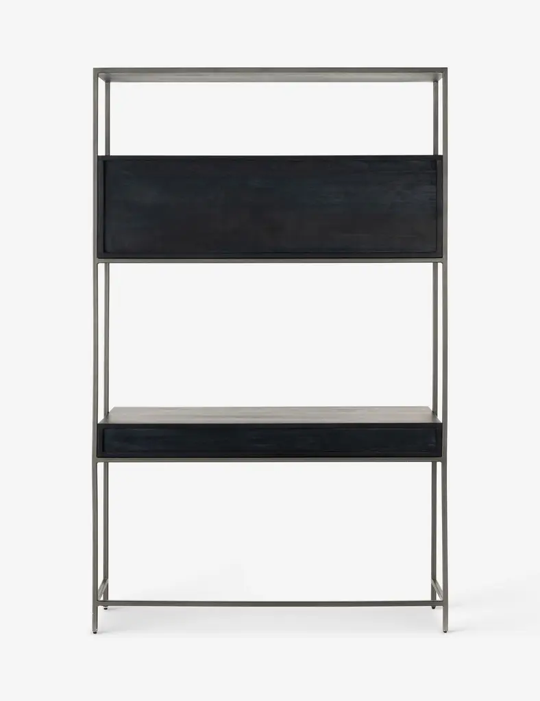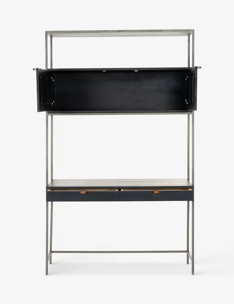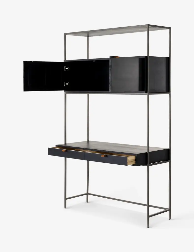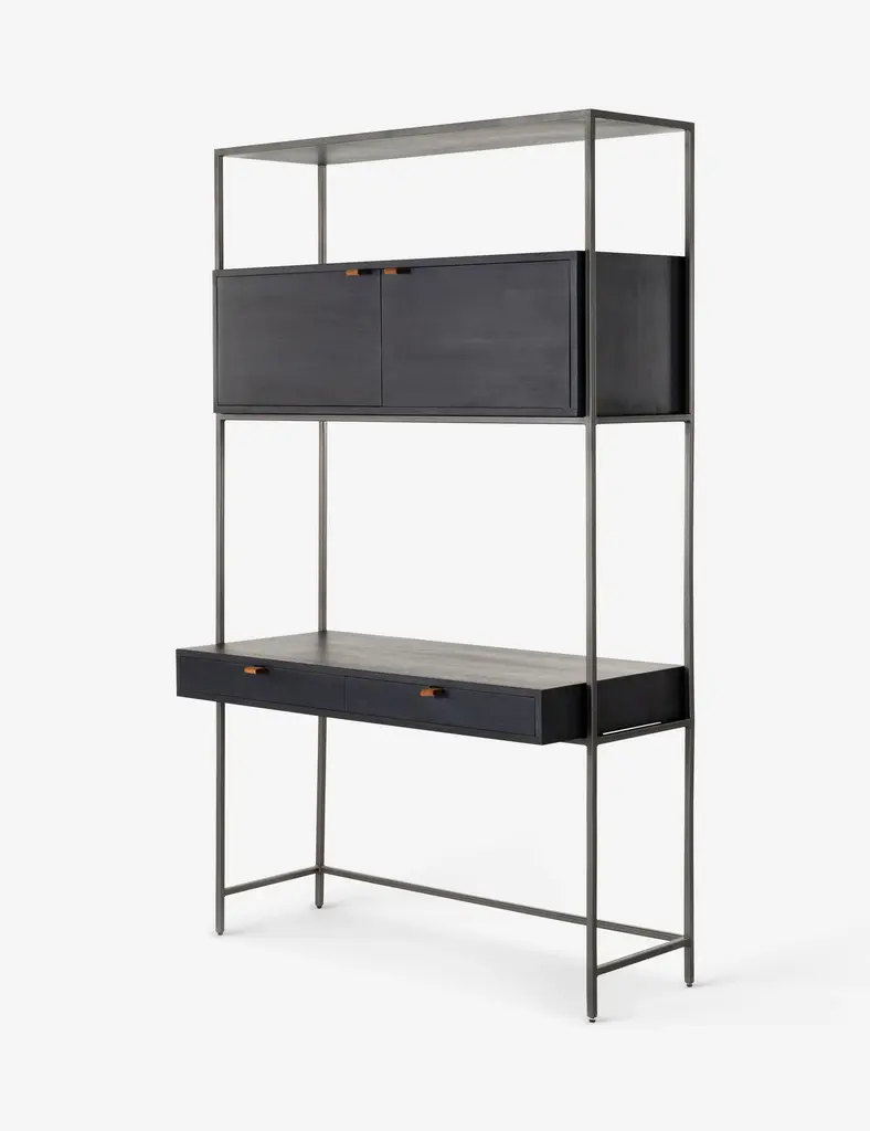 A slim iron frame lends this poplar desk and cabinet a floating look. Its dark finish, leather pulls, and modern silhouette offer a sleek desk space with plenty of surfaces and storage that can be decked with luxe decor and accents or left sparse for a touch of mid-century minimalism.