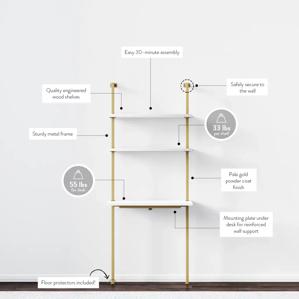 Functional, modular, and minimalist - our best selling Theo bookshelf now comes in a space-saving, wall-mounted desk design. The white and gold finish provides a touch of glam while two open-shelves offer space for books, storage bins, or just for styling with your favorite decor. Quality engineered wood shelves and a sturdy metal frame ensure structural integrity over time (and we even provide an extra mounting plate under the desk to reinforce the wall for additional support). Pair these Theo desks together or with a matching bookcase to create a larger workspace and additional storage. For smaller spaces, install Theo next to a bed so it can double as a nightstand and work area. Easy assembly will have you back to hustling, scheming, and creating in no time. #deskgoals? We think so.