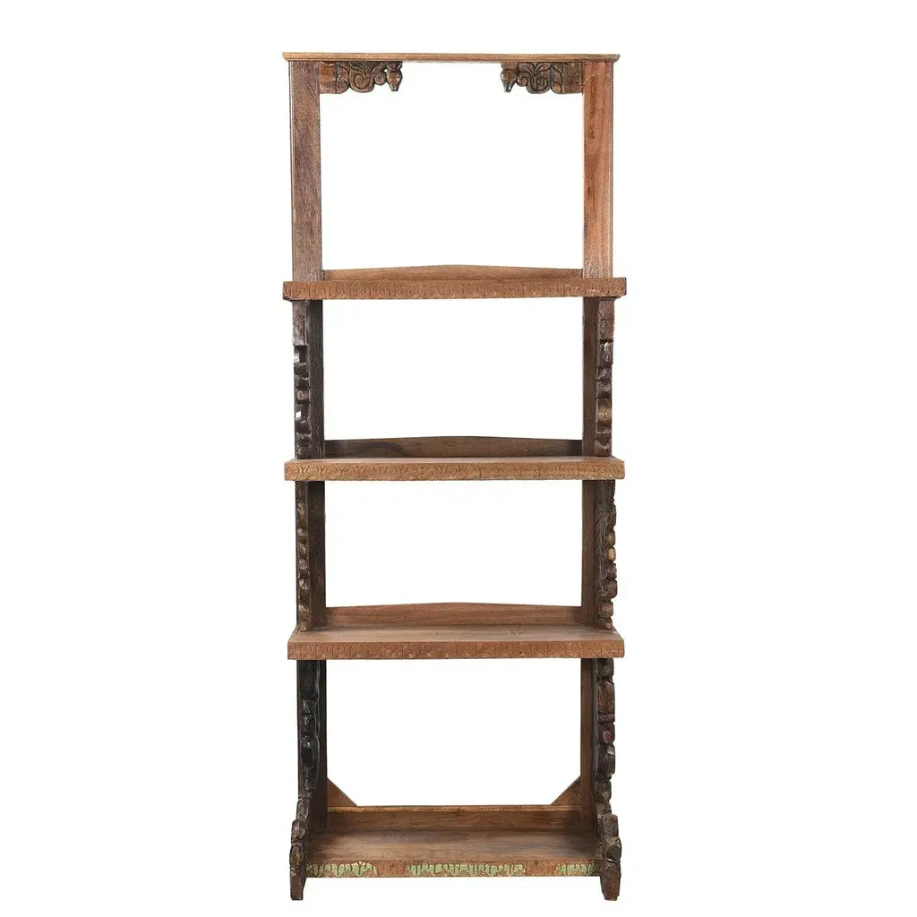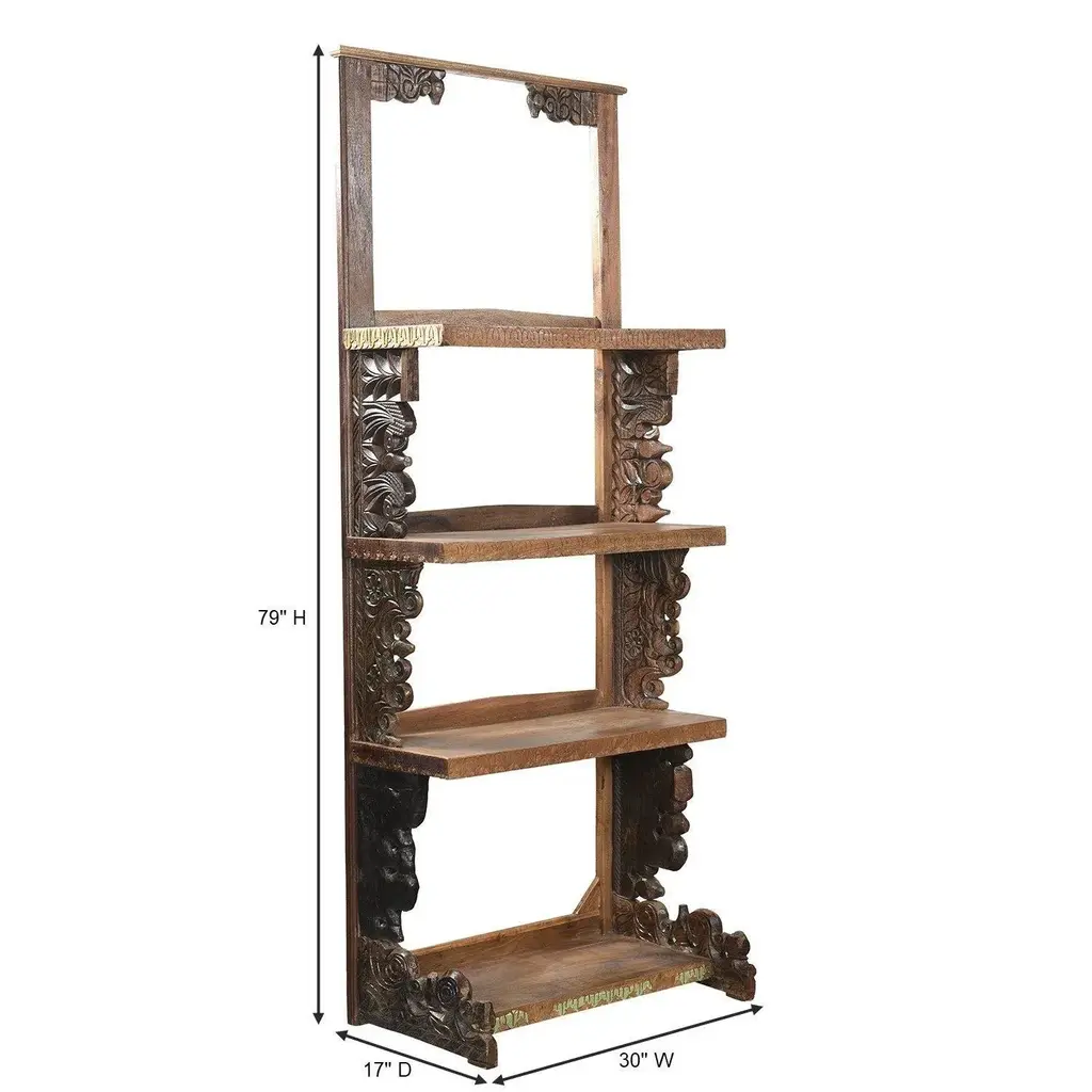 Dimensions: 30" W x 17" D x 79" H Features: • A rare piece and one of its kind exists • 100% solid wood construction • Antique hand carved corbels repurposed as sides of the display case • Hand carved by skilled artisans • Eclectic transitional style • Environmentally friendly and sustainable • Piece shown in the photos is the one that will be shipped Our Tall Handmade Farmhouse Solid Wood Open Shelf Bookcase piece utilizes old architectural elements, re-claimed woods and is handcrafted by artisans using basic hand tools. Due to the nature of this creative process, you can expect to find variations in their finish and color. Imperfections like uneven planks, knots, warping, cracks, splits, holes, discoloration, dents, scratches, wood repairs etc. are normal and considered enhancements to the nature of our collection. The listed dimensions are measured from one extremity to the other, height wise and width wise. Please contact us for specific dimensions. Construction: 100% Solid Wood Please note that color of products shown may vary slightly from their actual color due to monitor display settings or photography studio lighting. Please contact us for additional pictures. Thanks for looking! We enjoy serving you.