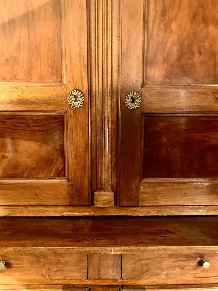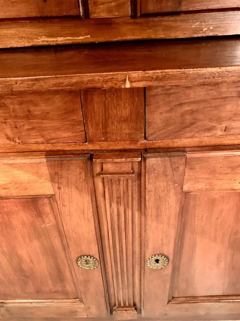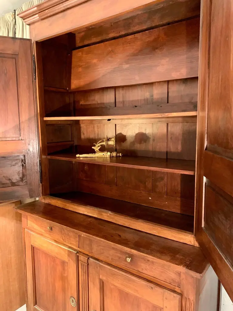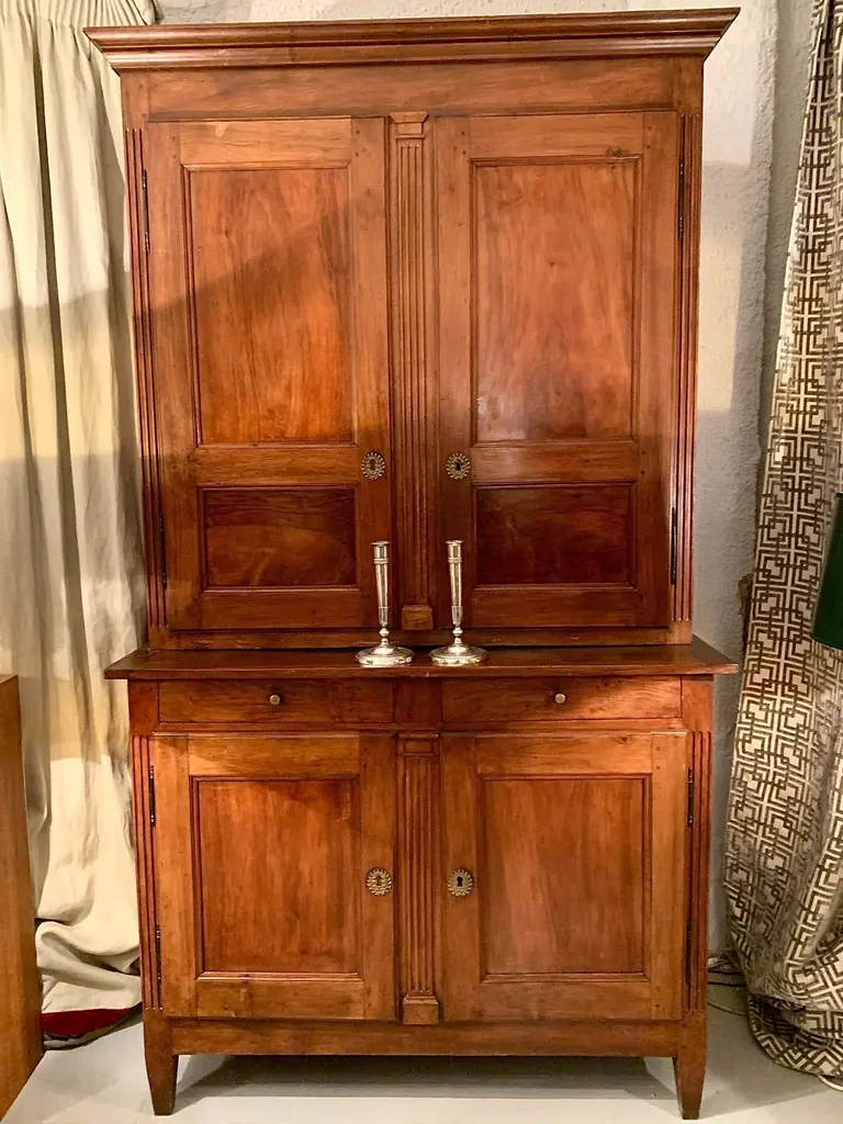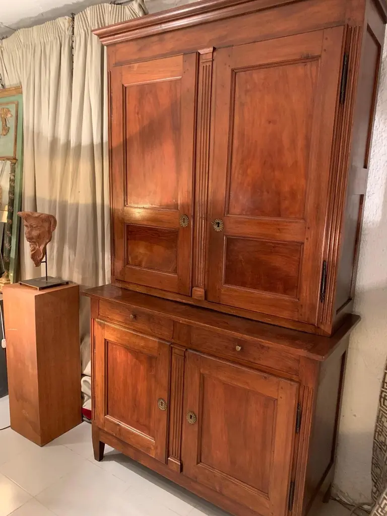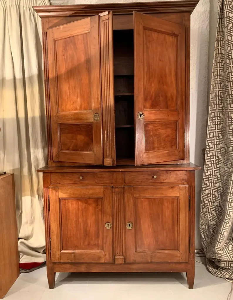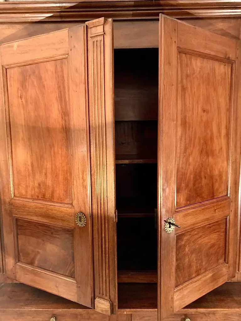 19th century French Directoire period oak bookcase or cabinet t has two parts that can be separated for easier transport. the upper part has a height of 125 cm with two doors and three adjustable shelves inside, the keyholes are in bronze.the lower part also has god doors with a shelf inside, and in its upper part two drawers, also the keyholes are bronze.,95 cm high.It is decorated in its corners and center with carved wood in the shape of a fluted column.