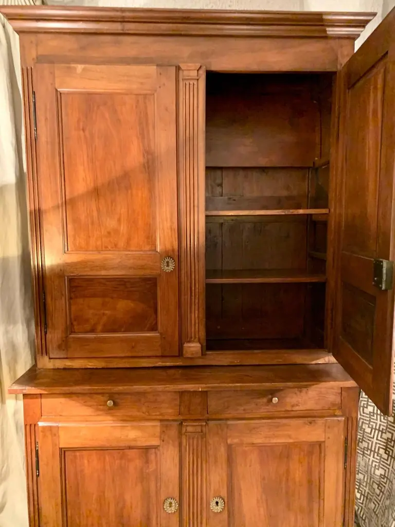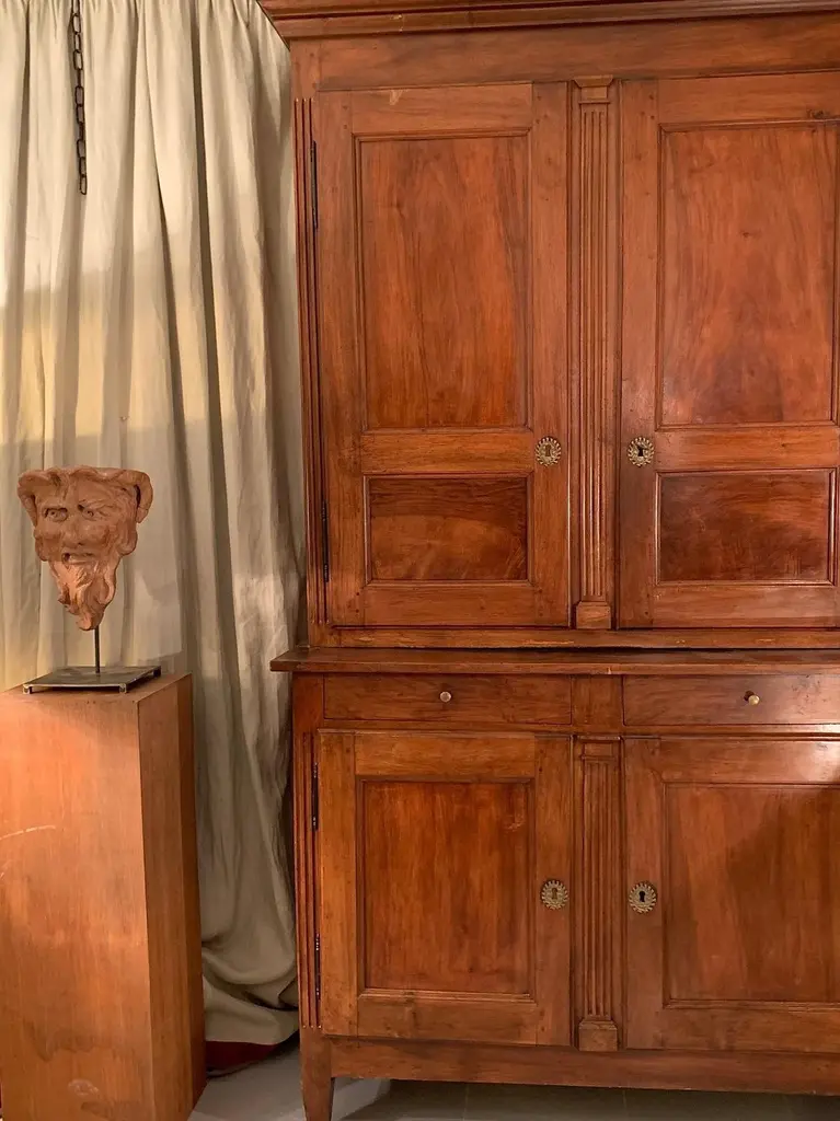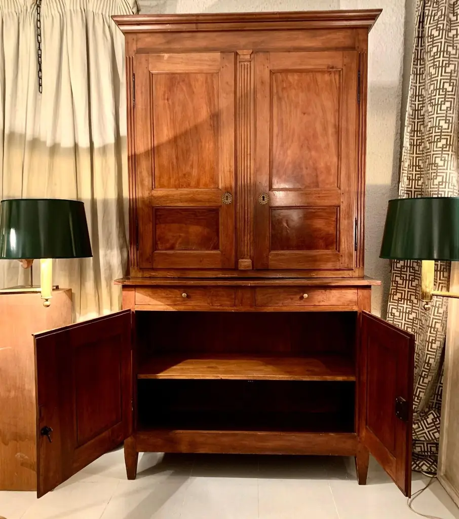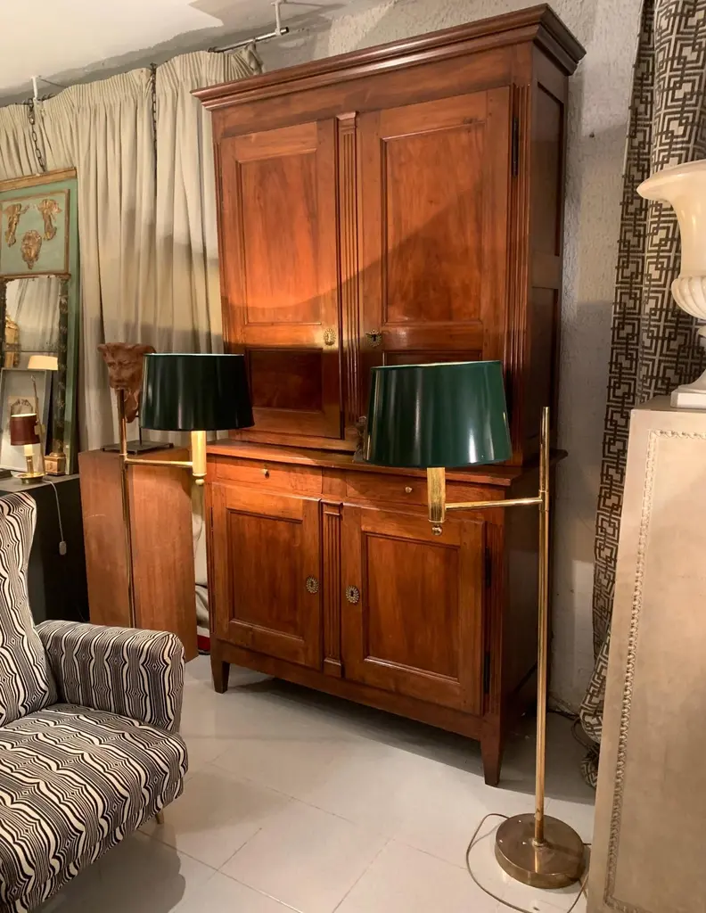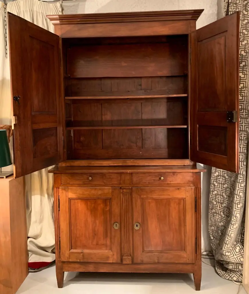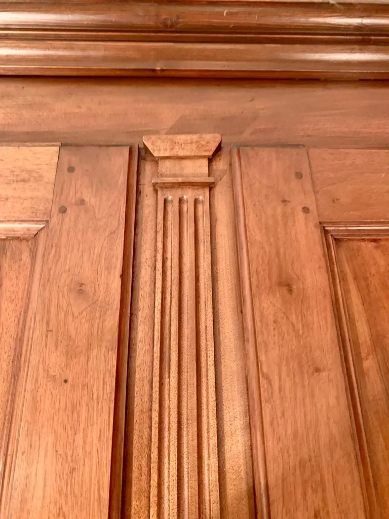 19th century French Directoire period oak bookcase or cabinet t has two parts that can be separated for easier transport. the upper part has a height of 125 cm with two doors and three adjustable shelves inside, the keyholes are in bronze.the lower part also has god doors with a shelf inside, and in its upper part two drawers, also the keyholes are bronze.,95 cm high.It is decorated in its corners and center with carved wood in the shape of a fluted column.