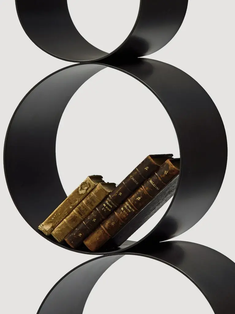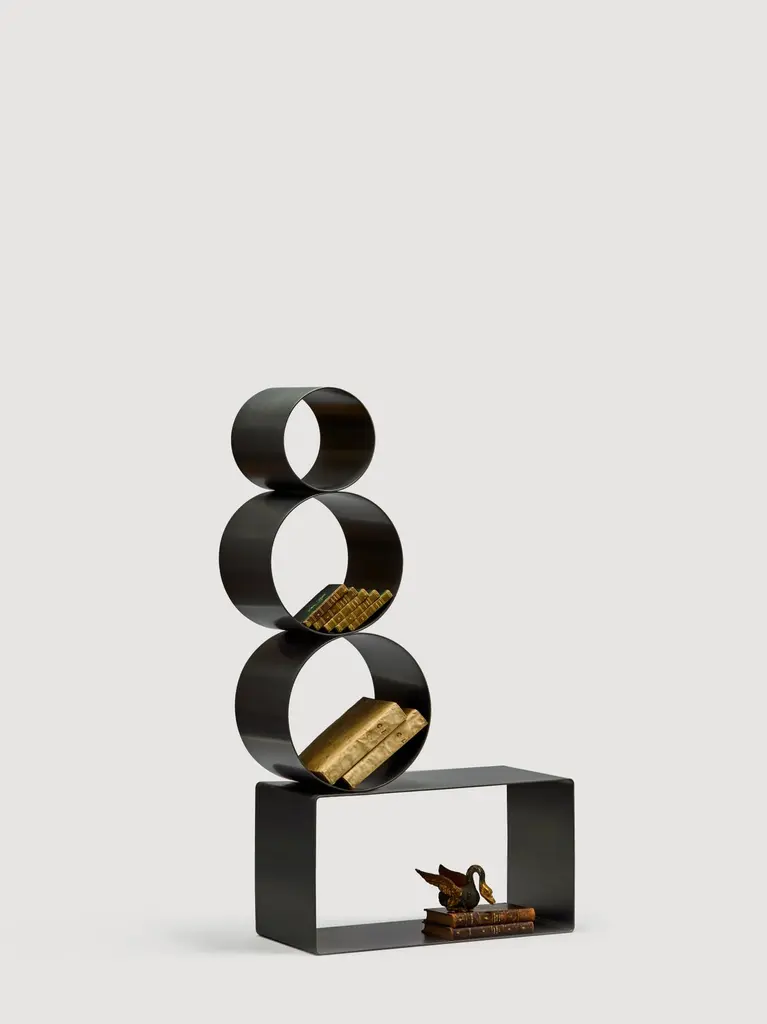 Bookcase, rings of different diameters obtained from calendered steel sheet and weldedamong themselves. Wall-fixing with dowels, hidden from sight by two steel discs fixed by magnets.