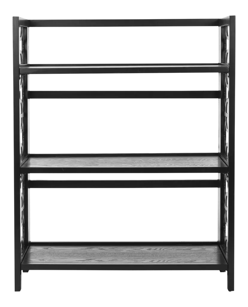 Organize in style with the distinctive low bookcase crafted of solid pine wood with black painted finish.Whether used alone or in pairs, this compact piece beautifully carved sides add architectural interest to any room. Wood is a natural material with variations of color shade, configuration, streaks, and grain structure. Each individual piece of furniture has characteristic markings that will differ from photo and showroom samples. Regular attention and maintenance of fine furniture can ensure it's beauty for years to come. Always use felt pads under all articles to prevent discoloration or softening of the lacquer. Plastic and rubber bases on items can discolor wood. Some assembly required.