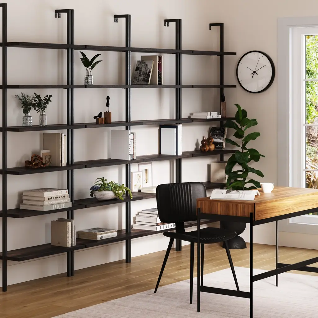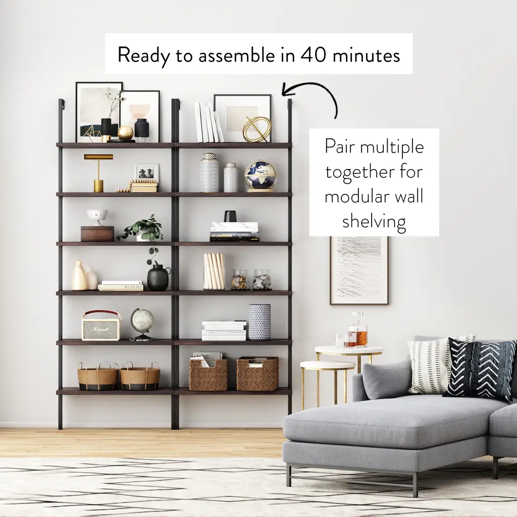 Theo bookcase dresses up any space with understated glamour. Contrasting wood shelves against metal with six shelves offering substantial storage in a office, living space, bedroom and beyond. With just the right touch of metal and wood, this large-scale storage piece is a polished piece to show off your favorite books and decor pieces. Made of quality materials to ensure the product’s structural integrity over time. Create complete modular wall unit by lining several bookcases up together on a wall.