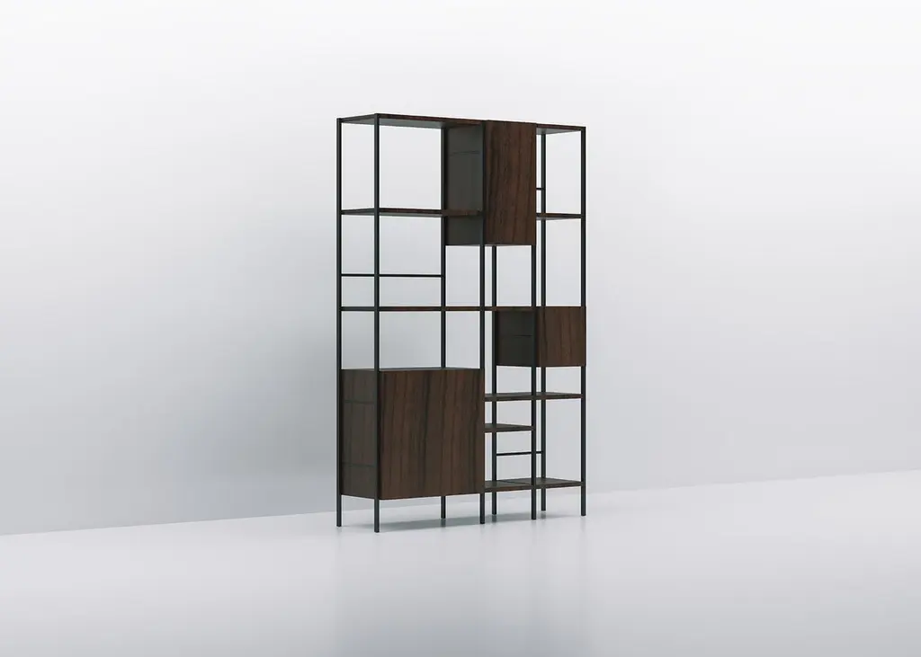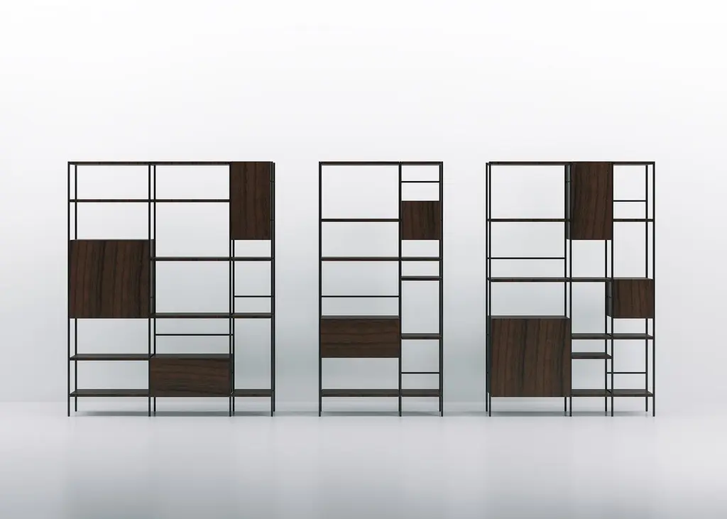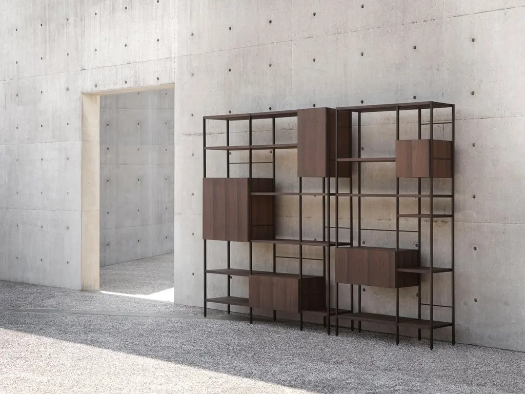 A freestanding bookcase, which can be placed against the wall or in the center of the room. The various elements can be inserted simply by sliding the round profiles of the metal structure into the unusual round recesses in the shelves and in the shoulders of the cabinets, a structural detail that is both functional and attractive. The special interlocking mount makes it possible to place the cabinets with the door openings alternating on the two sides for placement in the center of the room. Available in three different sizes (width 108, 144, 178 cm), each with its own configuration, they are designed to be placed together or separately. Cabinets have hinged or flap doors(R), depending on the type. The back of the furniture is completely finished. Additional rear panels, in the same thickness and finish as the doors, can be applied to the cabinets for center room setups. Glass shelves included.Self-supporting unit, it also has wall safety anchor at the back.Finishes:- Metal frame with painted satin Nikel Black finish, with adjustable feet.- Shelves and cabinets in heat-treated Eucalyptus or Swamp oakBorn in Milan in 1981, Giacomo Moor, after graduating in Design with a final dissertation on wood published by Abitare, opened his studio with his partner. With his multidisciplinary team, designers and woodworkers, he designs products for companies, he creates limited editions for galleries, produces unique pieces for private clients, and he is engaged in every step of the process. Giacomo Moor unites the precision and the formal rigour of the design with the sensitivity of manual craftsmanship, his empirical and resolving approach, and his capacity to combine technical and aesthetical skills, managing the production process, are constant elements of his working method.Additional information:Material: WoodShelf finish: Dark stained walnut ES59Frame finish: Satin steel - black nickel painted MT05Dimensions: 108 W x 41 D x 221 H cmAvailable in shelf other finish option: Eucalyptus ES48Available in other size options: 144x41x221, 178x41x221Available in other versions: Additional backrestAdditional rear finishing panels, of the same thickness and finish as the door (25 mm), applicable to units placed in the centre of the room
