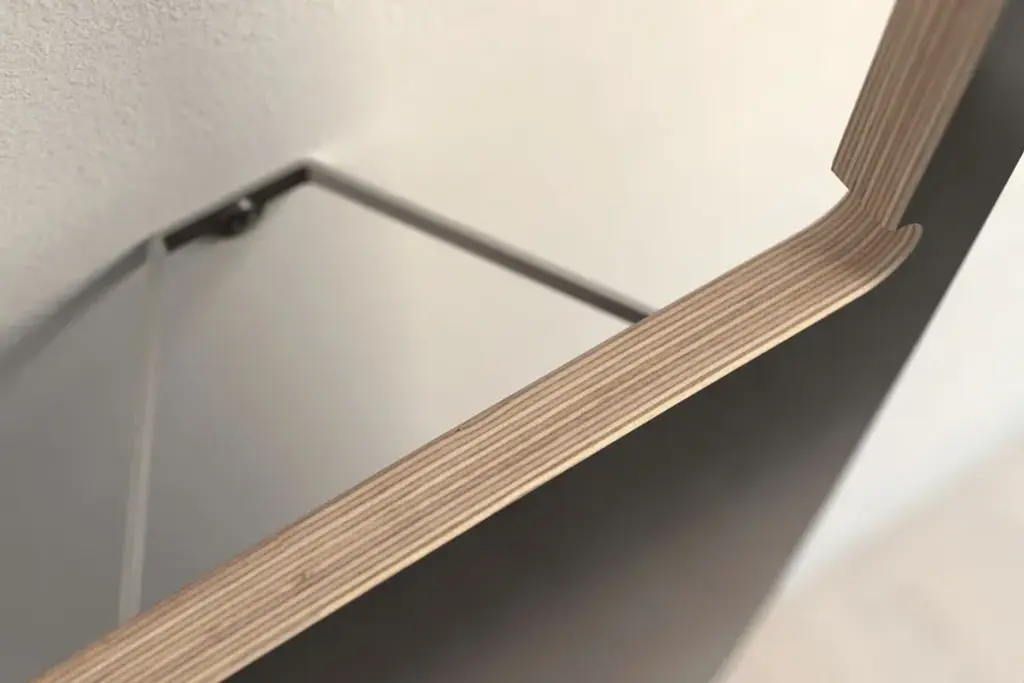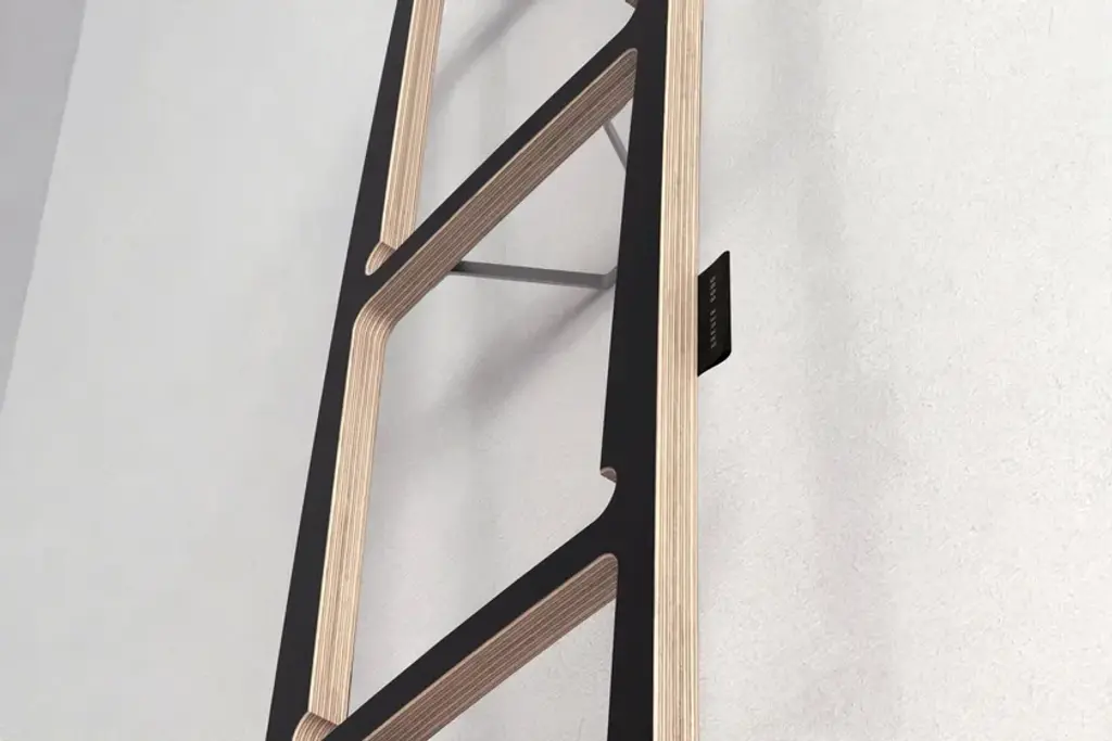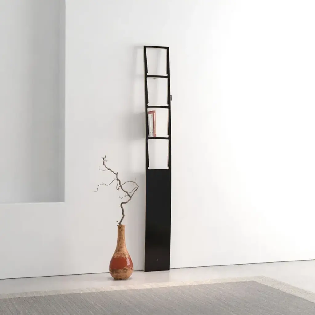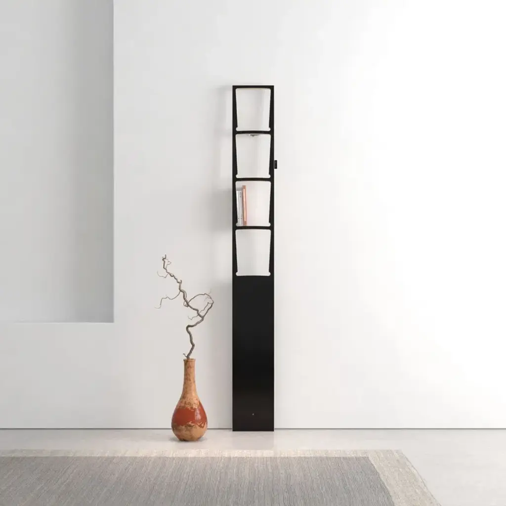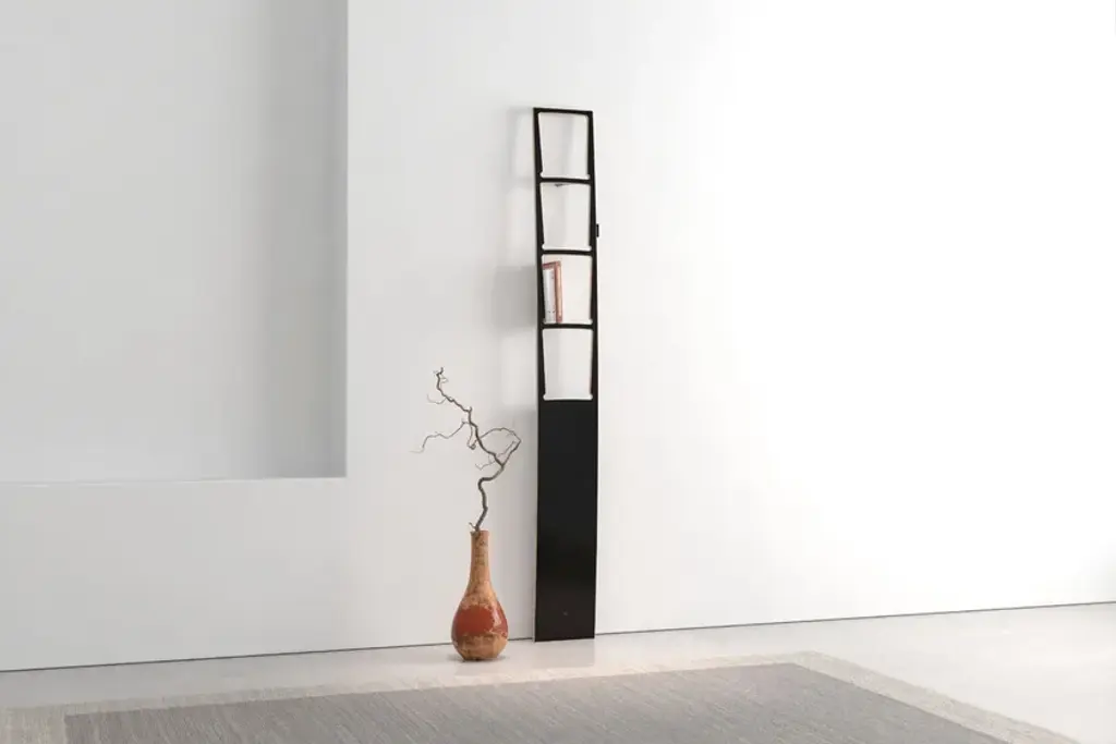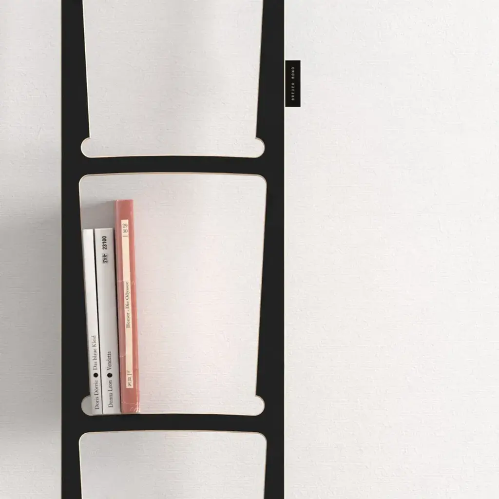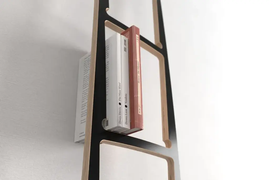 ADONIS is a board to store books. But rather than lying horizontally to place the books on it, it is standing vertically and you put the books inside. ADONIS is an intelligent and spacesaving object, that breaks completely new ground in its typology: The books stand on an edge. Materials:- birch multiplex coated in black- stainless steel