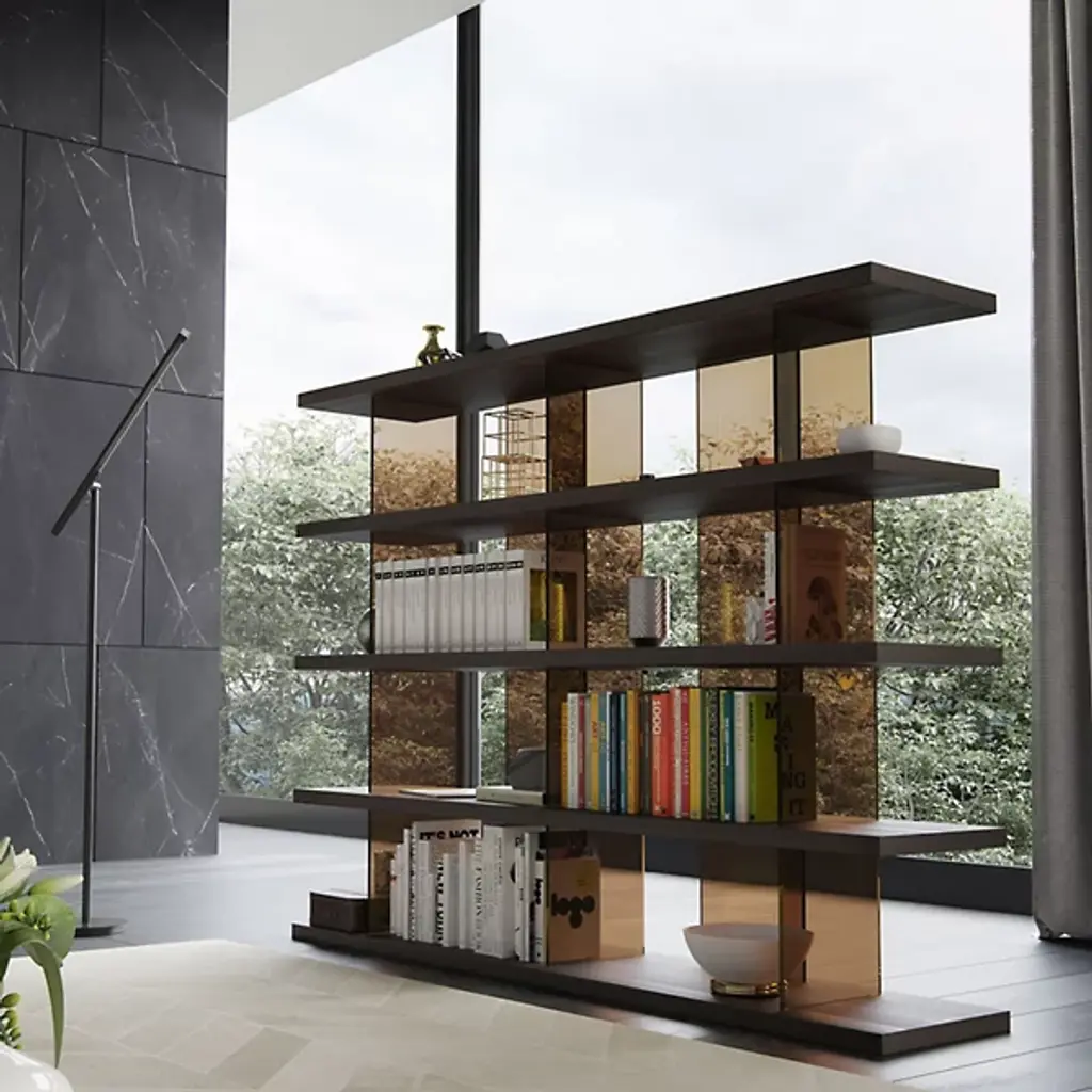 Minimal and elegant, the Huxe Agnola Bookcase stands tall with its modern design and unique elements. Available in your choice of warm wood veneers or high-gloss lacquers, the Agnola Bookcase is the perfect addition to any contemporary home. Amplifying its grace are smoked transparent glass columns in complementary colors. Allow your creativity to shine by taking advantage of the unbelievable amount of storage space it provides.