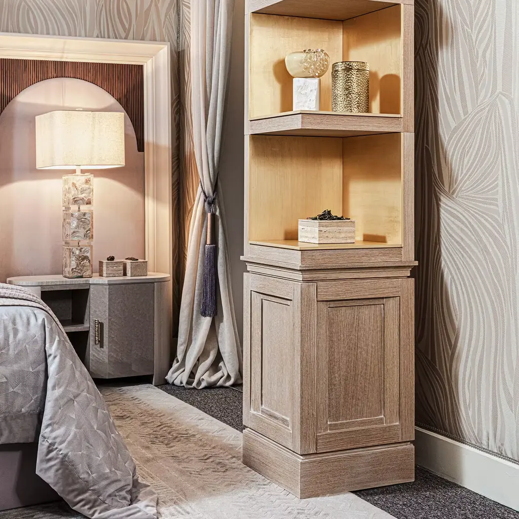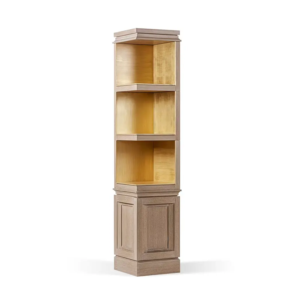 The Akiba Oak lacquered bookcase, expertly crafted from lustrous oak wood, boasts a sleek and sophisticated design, enhanced by its modular composition, allowing for versatility and adaptability to suit any storage needs. The paneles are ingeniously removable and customizable, providing endless possibilities to curate a personalized display.