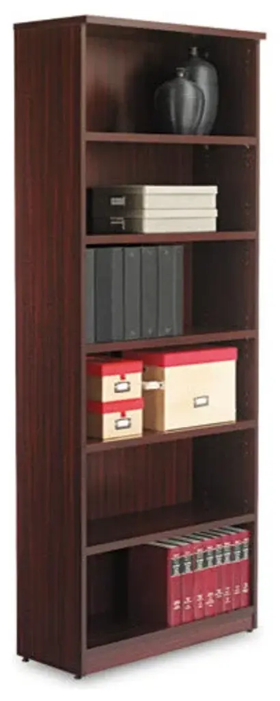Woodgrain laminate bookcase features a contemporary design that fits perfectly in professional environments. Commercial-grade side panels with protective 3 mm edge banding provide excellent dent and scratch-resistance. 11 3/4 deep (three adjustable) shelves accommodate a wide range of materials. Top panel is 14 deep for door installation. Tight, dowel and cam-lock assembly provides a clean look while ensuring overall stability.Contemporary design; woodgrain laminate construction.Commercial-grade side panels with protective edges.11 3/4 deep (three adjustable) shelves.Matches all Valencia Series products, heights align with desks and hutches.Tight, dowel and cam-lock assembly.Shelves hold up to 150 lbs. per shelf.Global Product Type: Bookcases-Shelf BookcaseColor: MahoganyMaterial: Woodgrain LaminateShelf Count: 6Overall Height (in.): 80 3/8Overall Depth (in.): 14Overall Width (in.): 31 3/4Shelf Capacity (Weight): 150 lbs.Shelf Thickness (in.): 1Edge Detail Profile: 3mm Protective Edge BandingSeries Name: Alera Valencia SeriesCompliance Standards: Meets or exceeds ANSI/BIFMA Standards