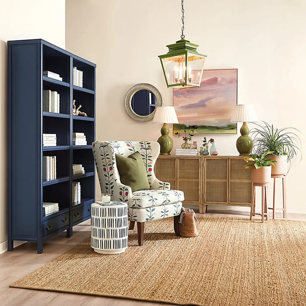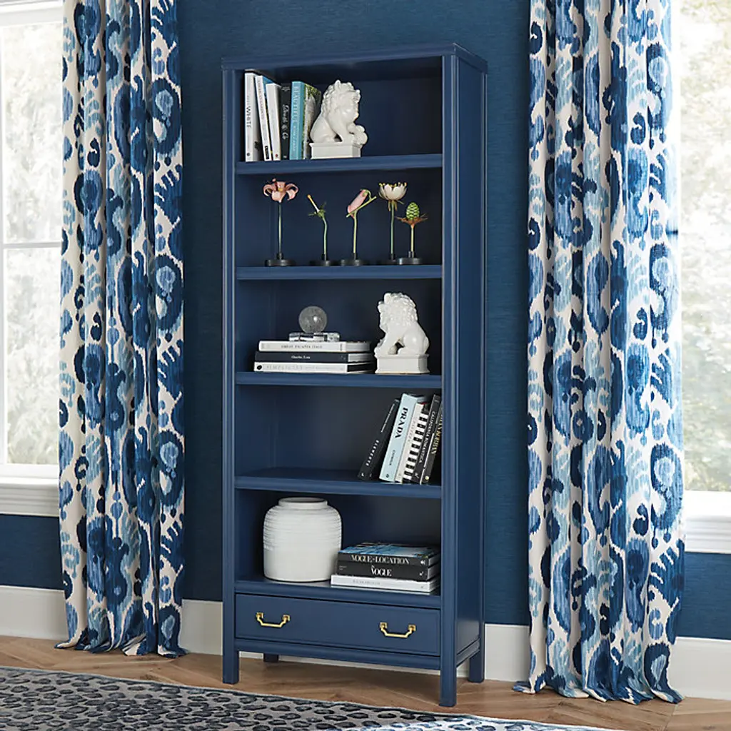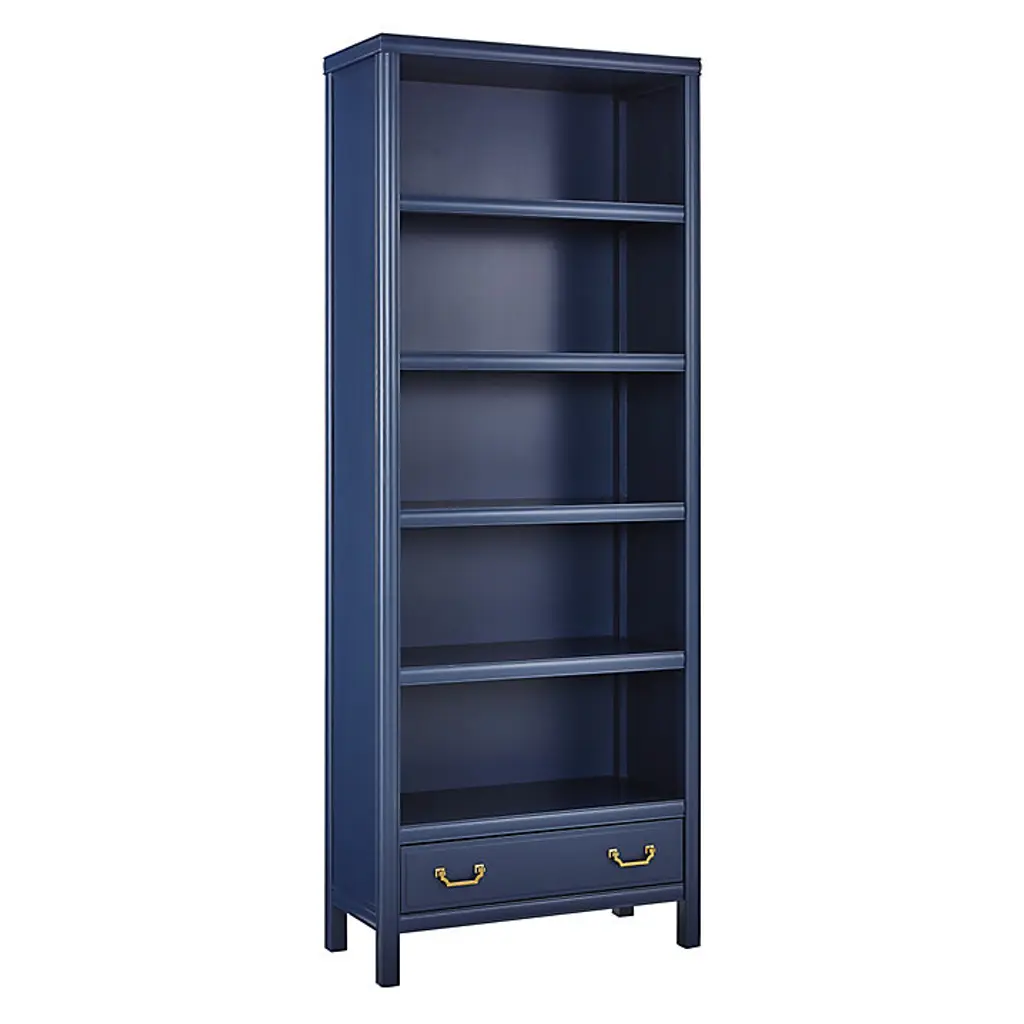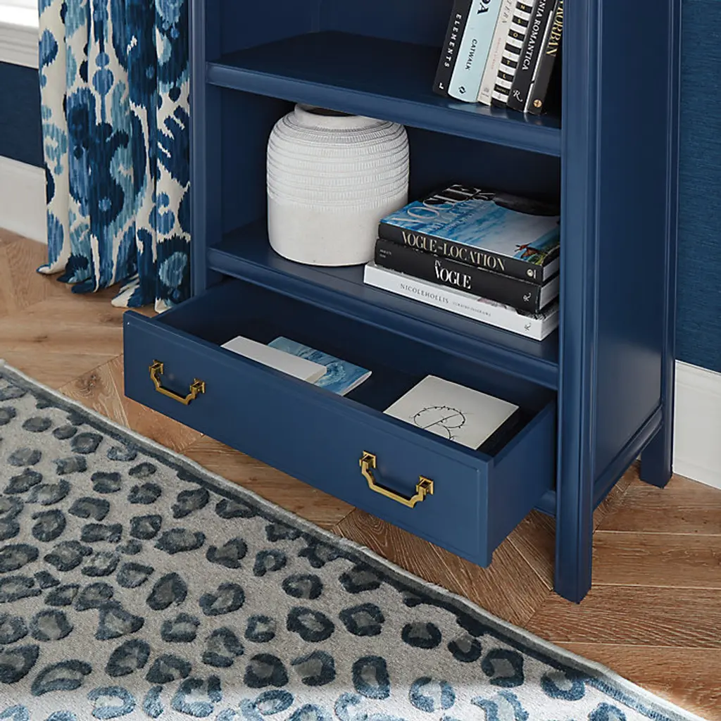 The sophisticated global silhouettes that make our Aman Office Collection so striking were inspired by Asian antiques. The statuesque Aman Bookcase is crafted of hardwood with raised panel details and finished in a gorgeous navy blue. Five fixed shelves create plenty of storage and display space for books and decorative accents. A slender drawer at the base offers extra hidden storage. Custom antique brass pulls have finely crafted clipped corner details. Edges are gently rounded and softened in the classic Asian style. Aman Bookcase features: