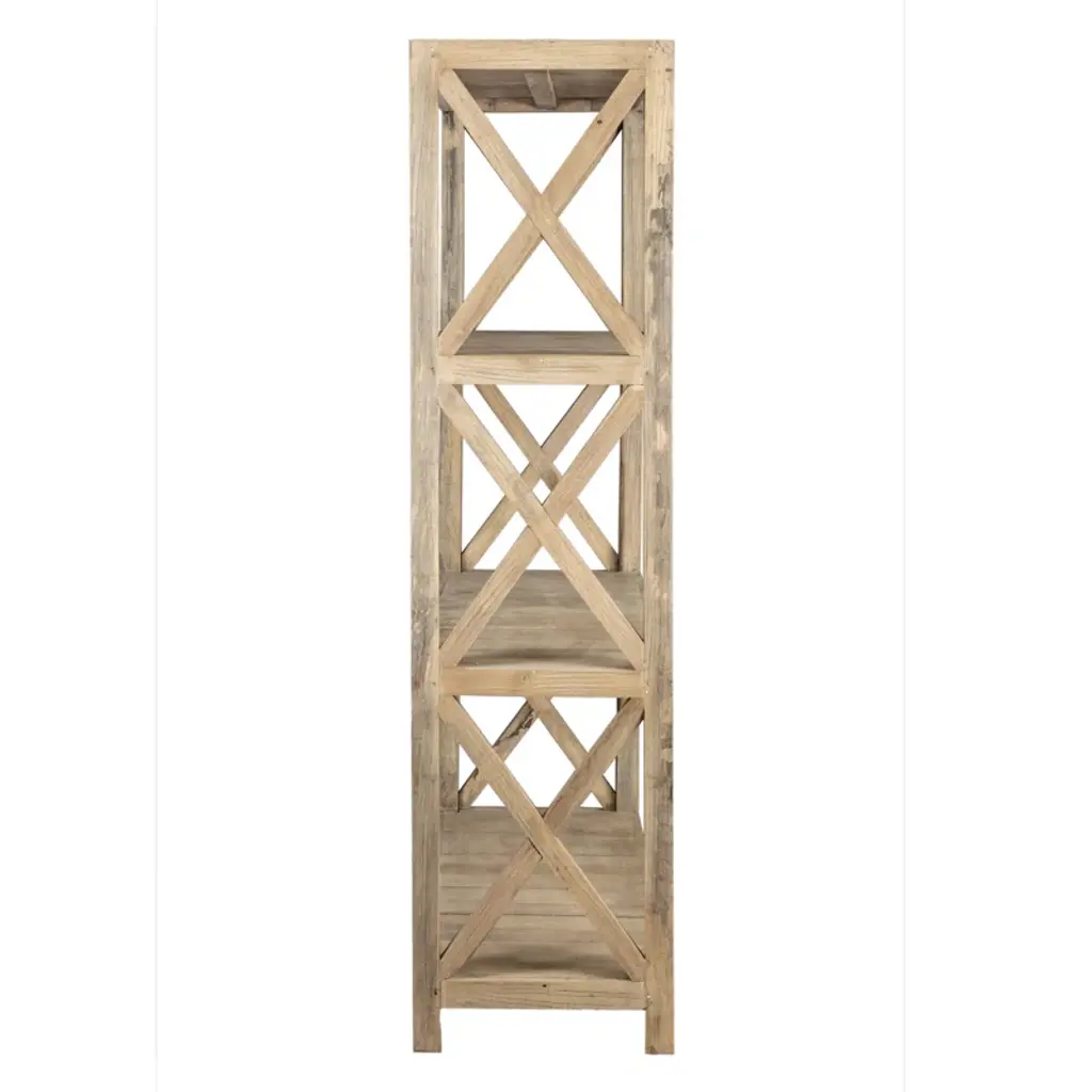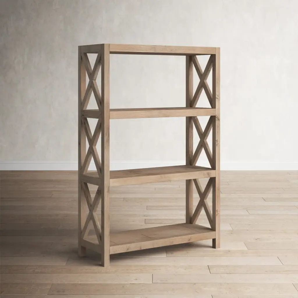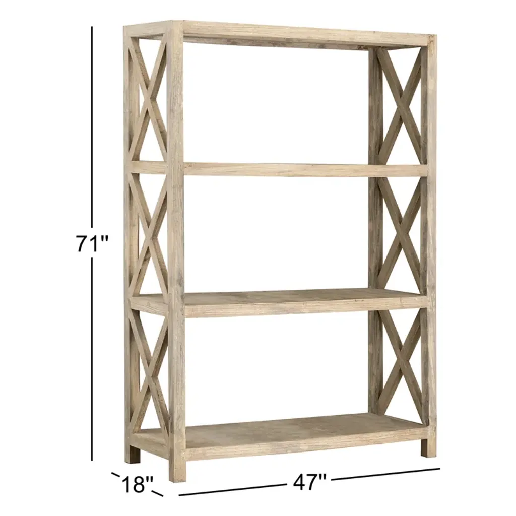 Marrying modern farmhouse flair with rustic character, this etagere bookcase lets you show off framed family photos, potted plants, and artful accents in on-trend style. Crafted from solid mindi wood, this piece sports a natural finish for an understated and airy look. Three tiers provide a place for a decorative display, while classic cross details along both sides offer extra support and complete the design with a traditional touch. No assembly is required.
