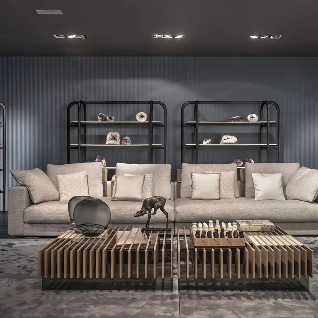 A stunning contemporary design, this bookcase is the perfect complement to any style interior, merging its clean character with the colored books filling its refined shelves. Handmade of solid wood veneered with ash, the four shelves are covered with leather. Completed with pewter-finished metal details, it is available in four colors, natural, anthracite, biscuit, and ash.
