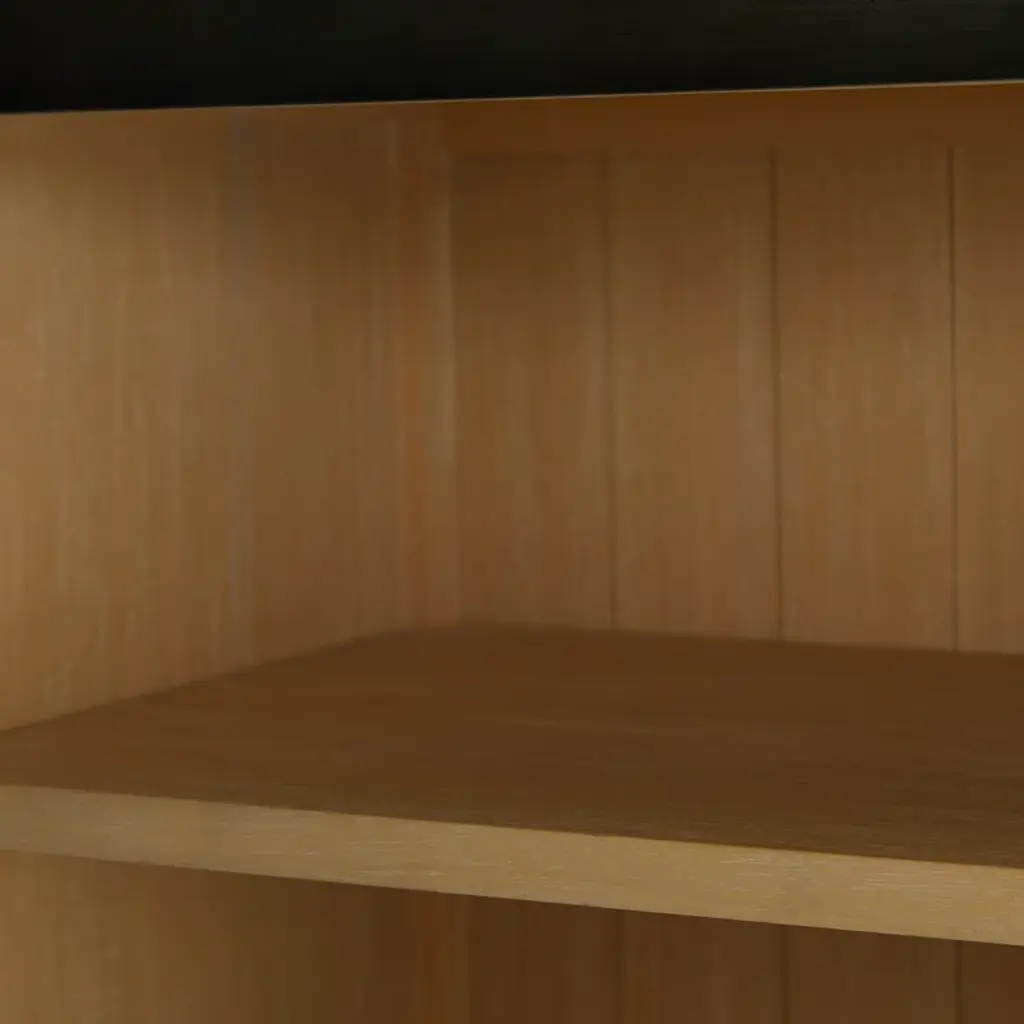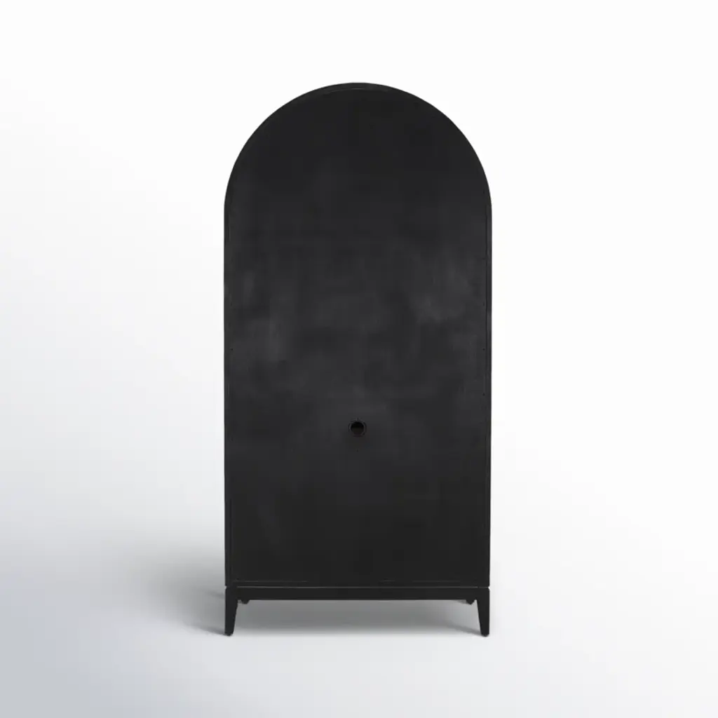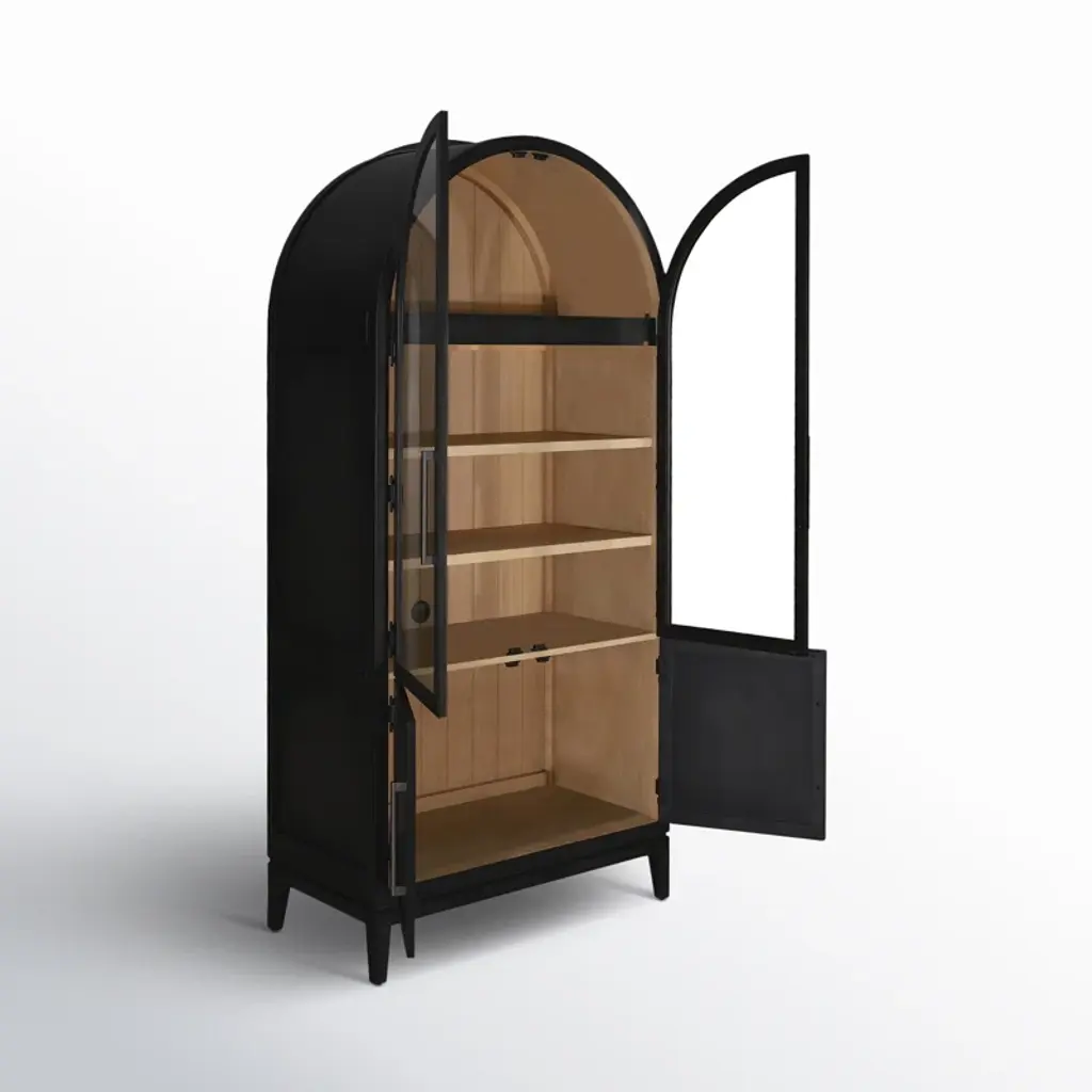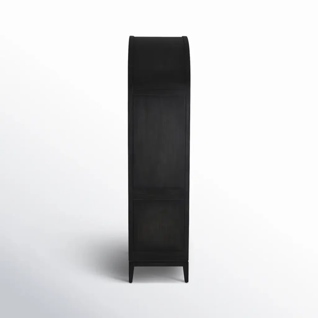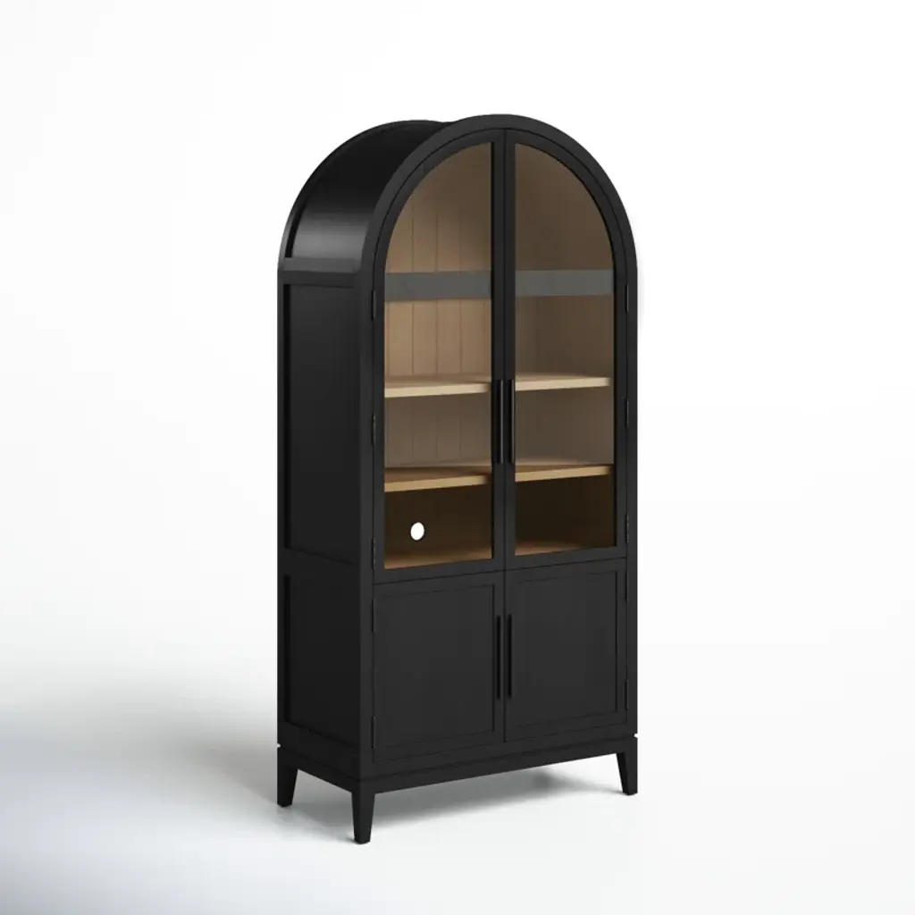 This arched bookcase makes a striking statement with its bold black finish and natural interior. Crafted from kiln-dried wood, it features glass-panel doors, six shelves, and a hidden lower cabinet for versatile storage. Perfect for showcasing books and décor, it also includes a cord cutout and wall anchor to keep your space stylish and secure.
