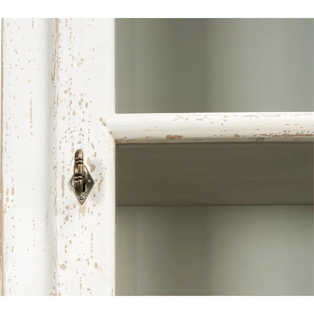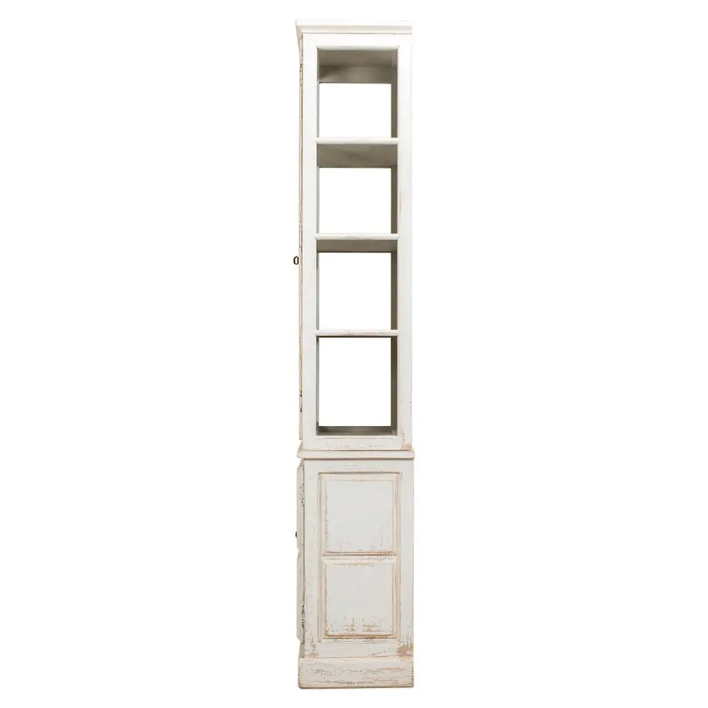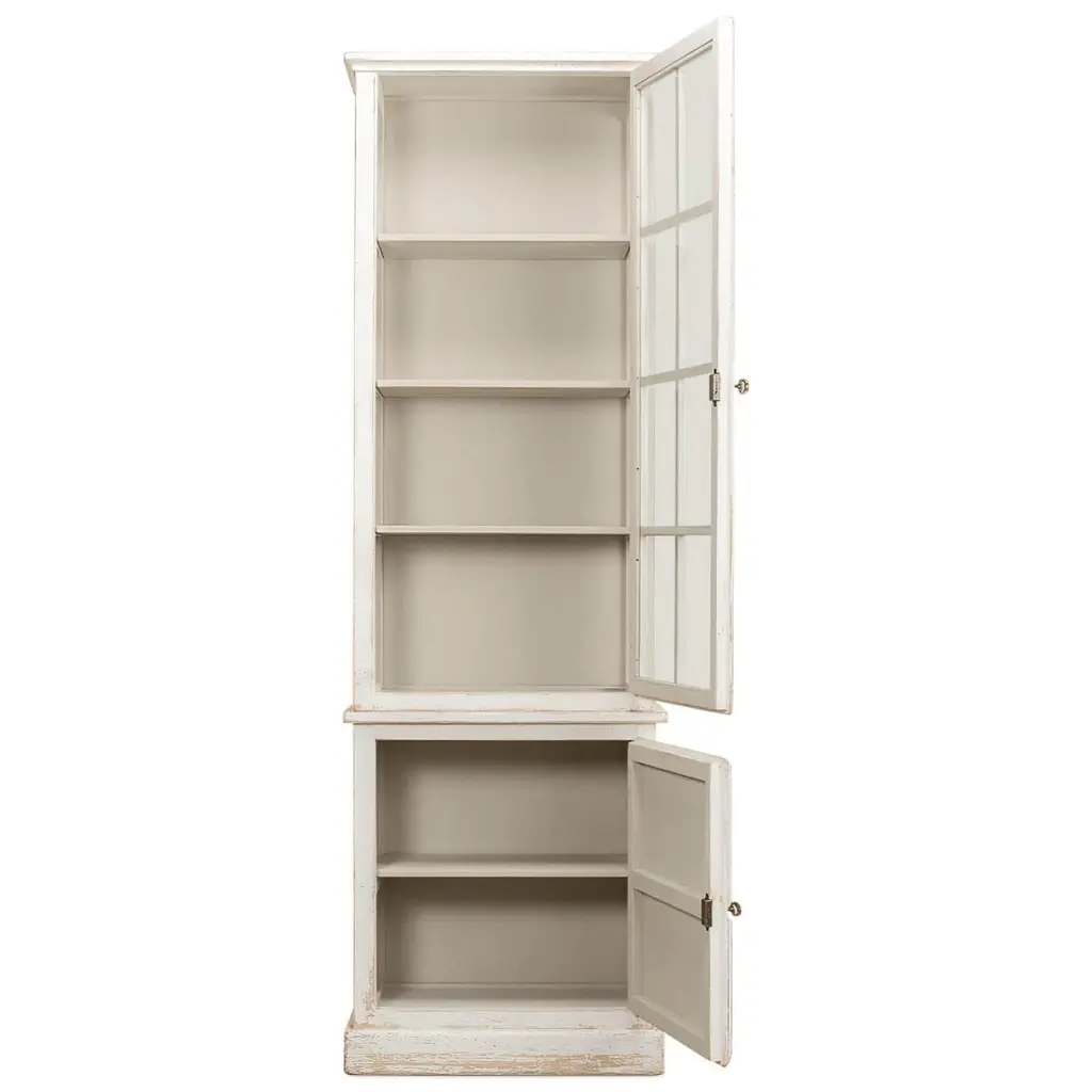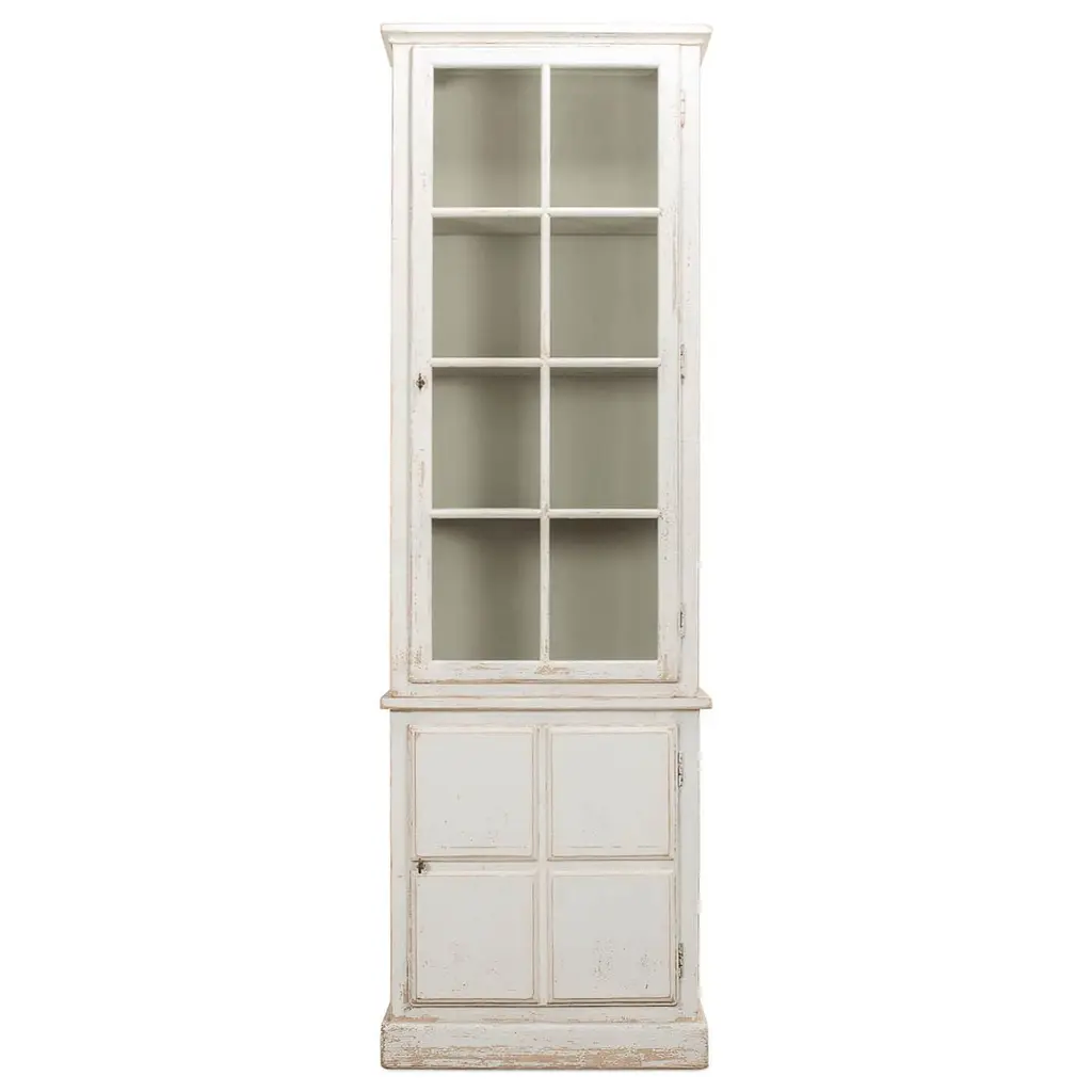 An antiqued white bookcase crafted with pine. This beautiful piece has a glass-paned upper cabinet with a painted grey interior and one lower cabinet with a door. It includes four removable shelves. This is a great piece for storage and display.Dimensions29" W x 16" D x 91" H.