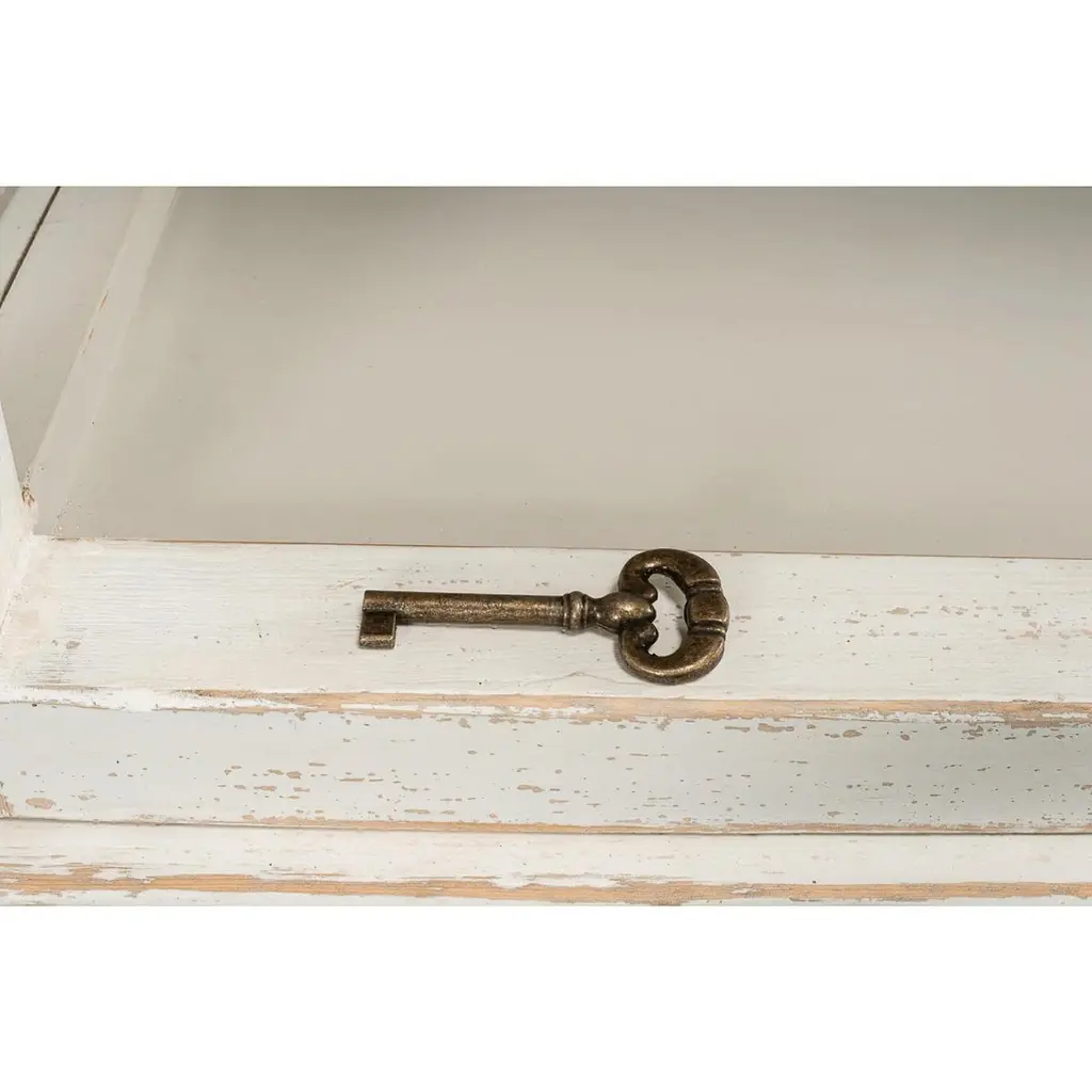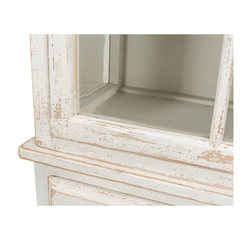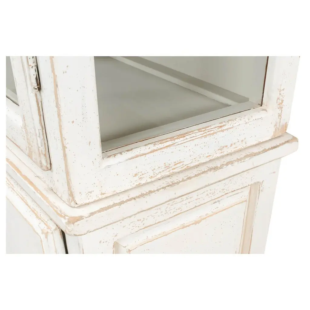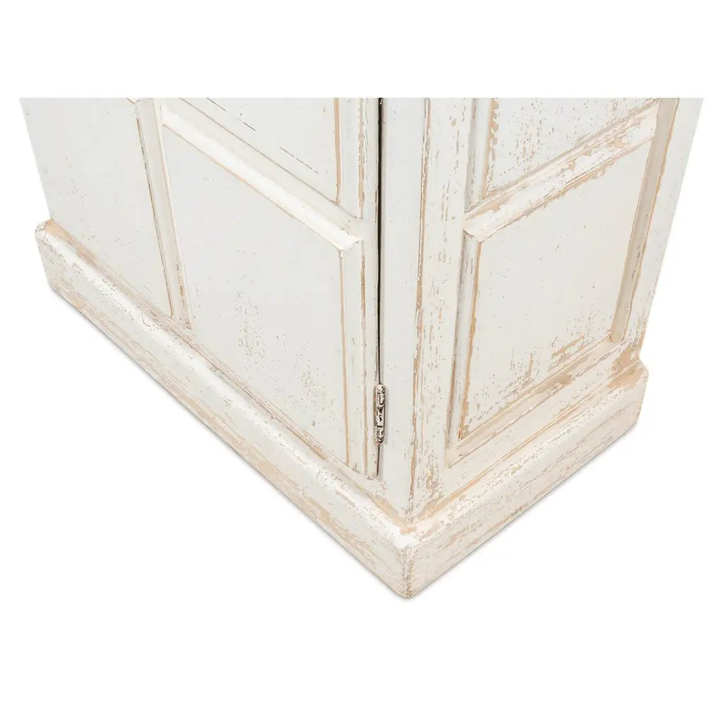 An antiqued white bookcase crafted with pine. This beautiful piece has a glass-paned upper cabinet with a painted grey interior and one lower cabinet with a door. It includes four removable shelves. This is a great piece for storage and display.Dimensions29" W x 16" D x 91" H.