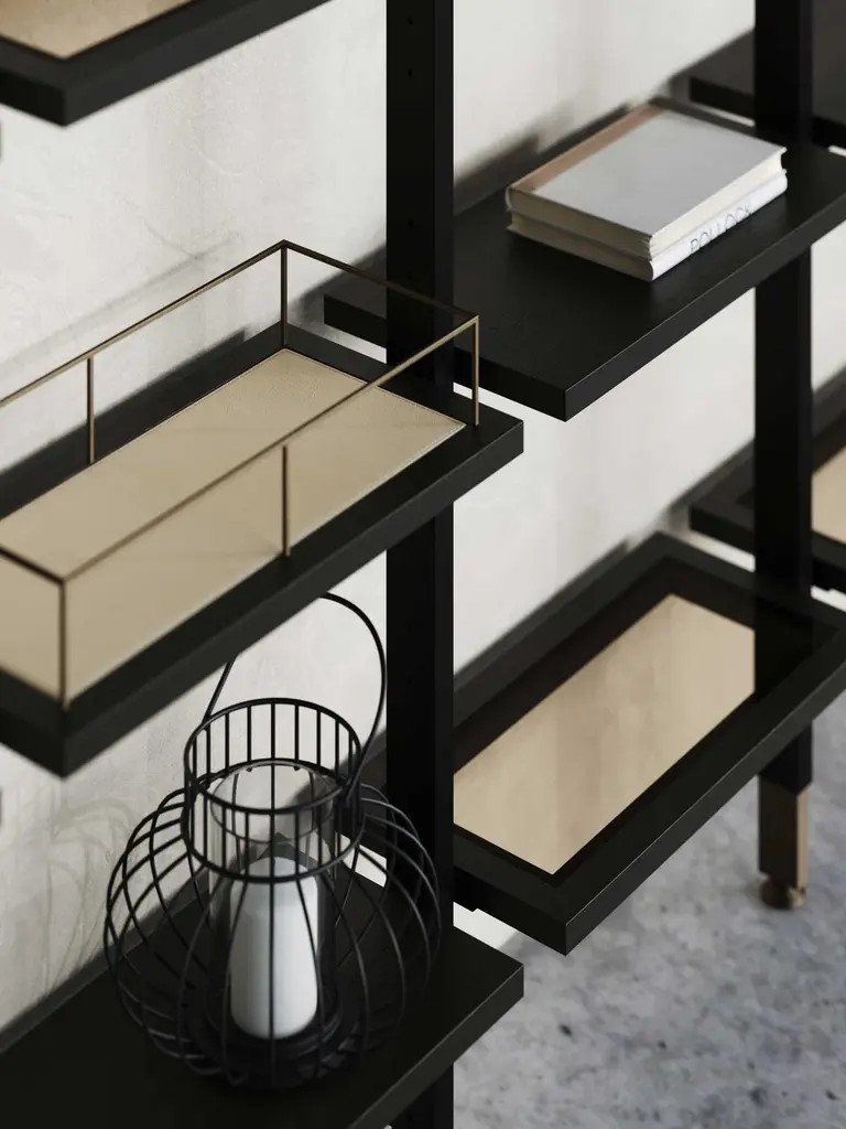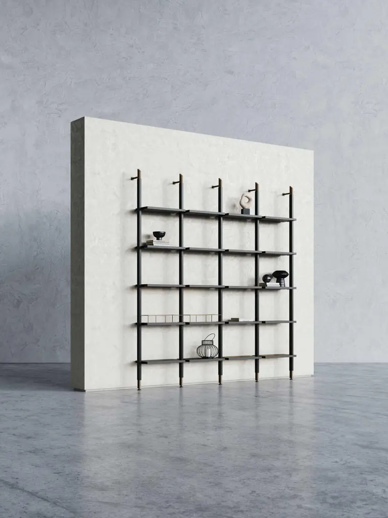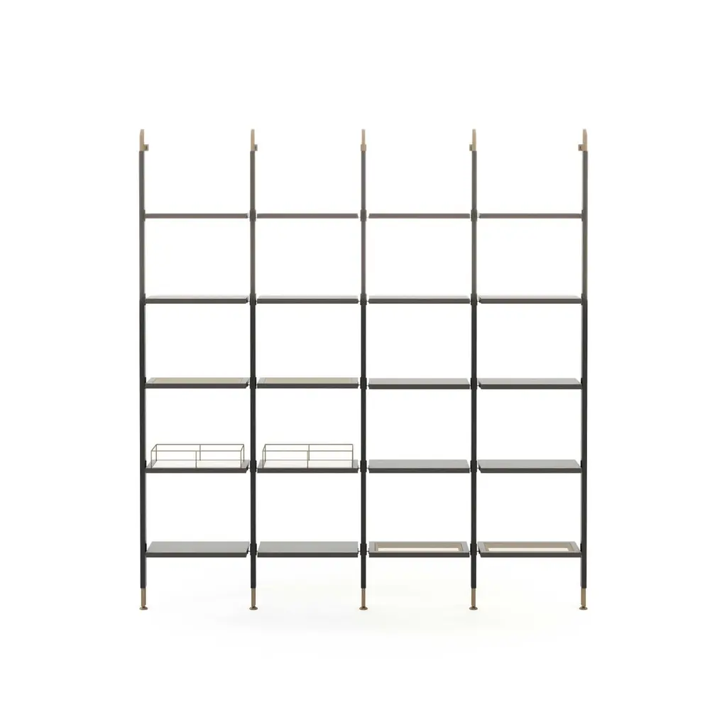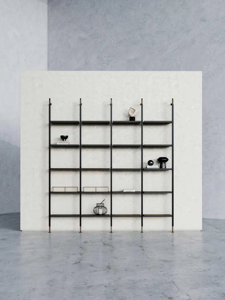 Composition DescriptionWall mounting bracket - 5 x 3 x H285 cmMate black metal (SCM-16) + Bims in brushed bronze metal (SCM-14)Shelves low profile 800 - 80 x 50 x H3 cmMate dark oak wood veneer (SCF-20)Shelves low profile 800 - 80 x 50 x H3 cmMate dark oak wood veneer (SCF-20) + Bronze glass (SCG-10)Shelves low profile 800 - 80 x 50 x H3 cmMate dark oak wood veneer (SCF-20) + Brushed bronze metal frame (SCM-14)And natural beige leather (Class 2)His Day System is a polished concept that blurs the boundaries between day and night. By interconnecting bookshelves, and TV cabinets, this modular system accommodates everything that comes to life during the day.In times when purposeful pieces are desired, His Day System evokes a feeling that everything is in the right place. It is more than just a combination of furniture; it’s a way to free you from a busy lifestyle full of simultaneous events, radiating a real sense of relief.As the product can be personalised, the image of the presentation is merely illustrative.